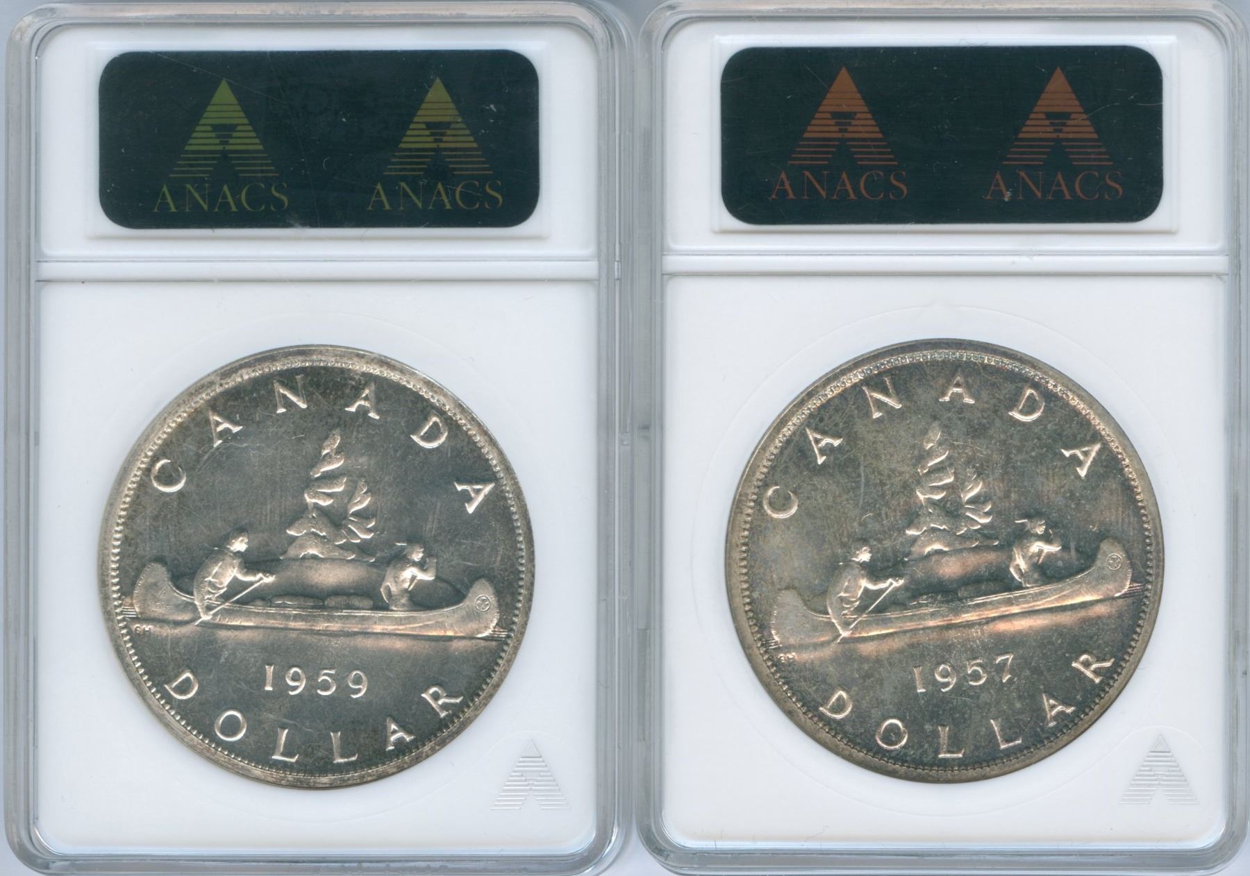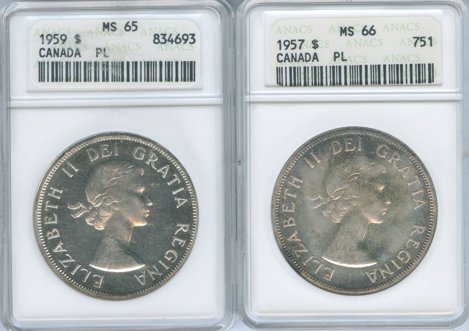 1957 ANACS MS66, 1959 ANACS MS65. Both lightly toned as shown. 2 pcs.
