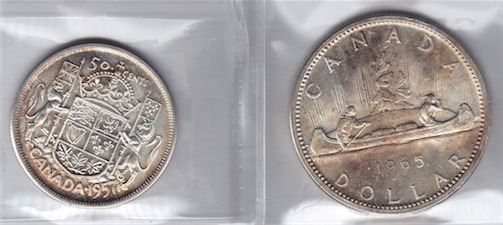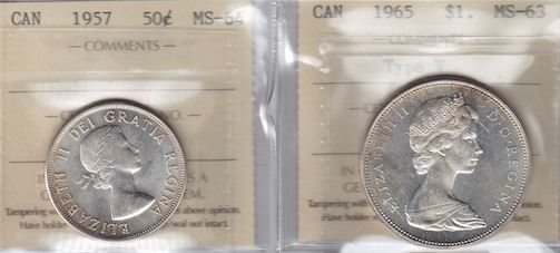 Includes: 1957 Fifty Cents MS-64. 1965 Type V Silver Dollar MS-63. 2 Pcs.