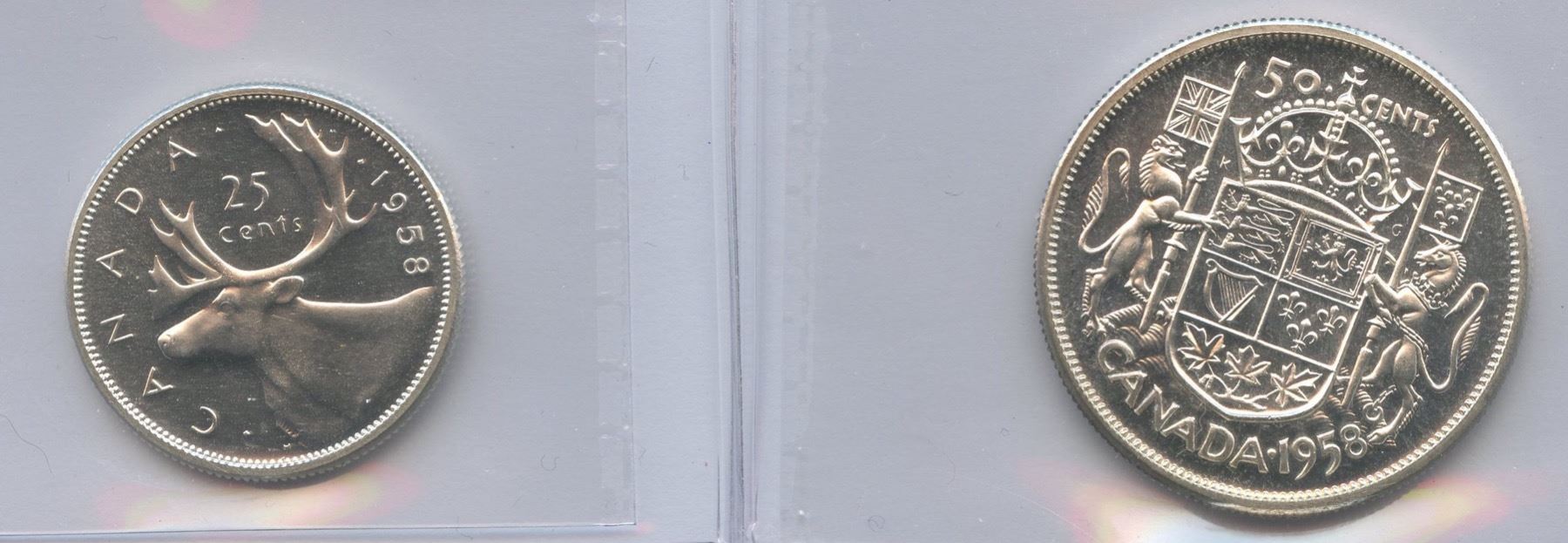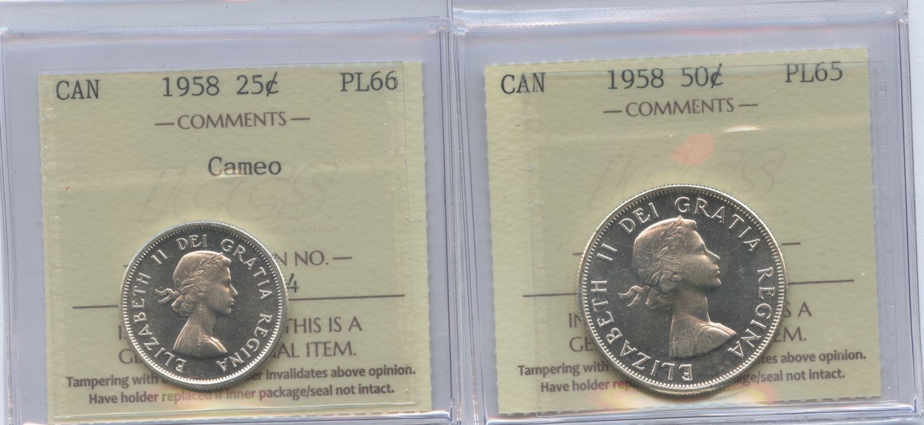 Includes: 1958 Twenty-Five Cents PL66, cameo. 1958 Fifty Cents PL65. 2 Pcs.