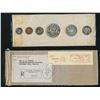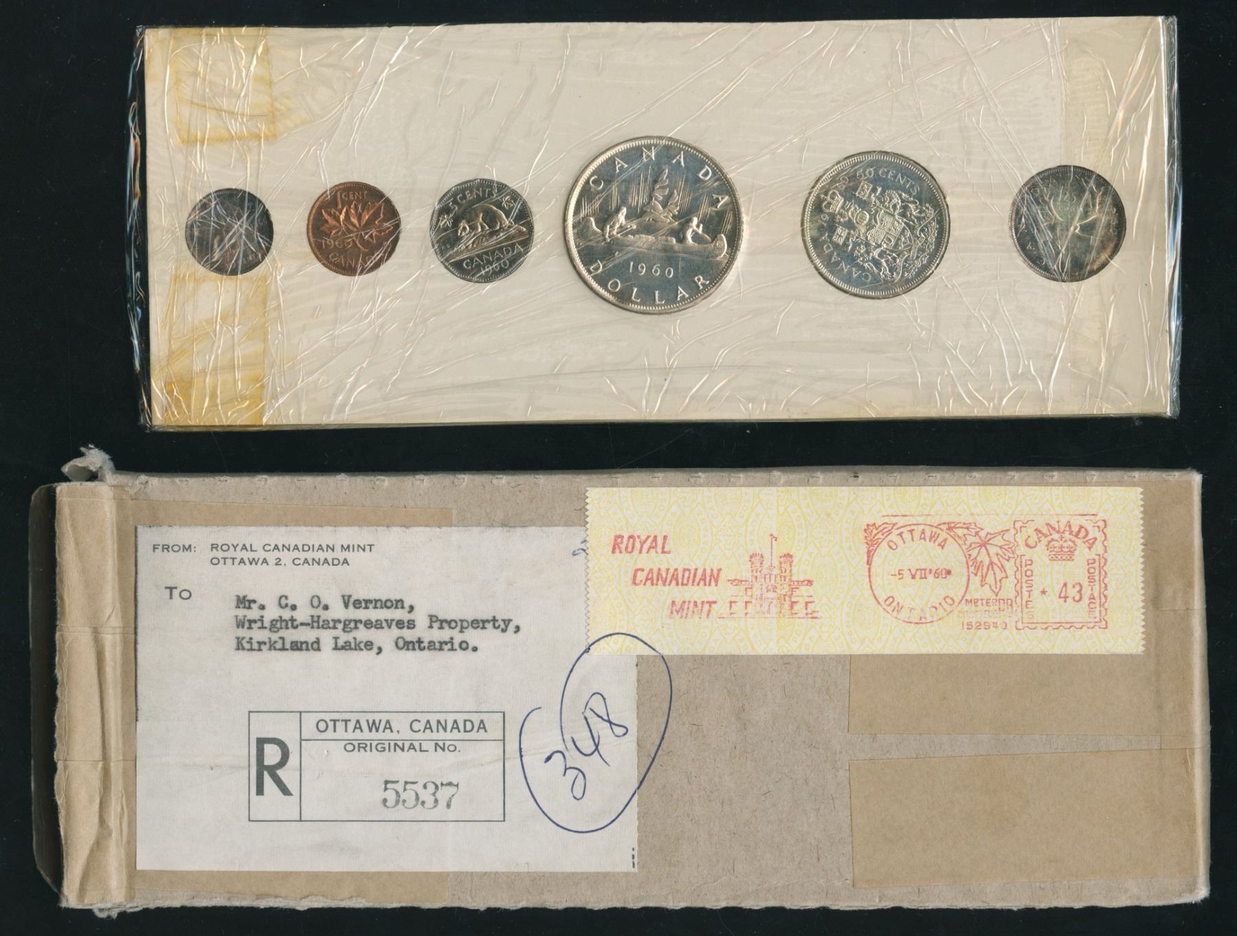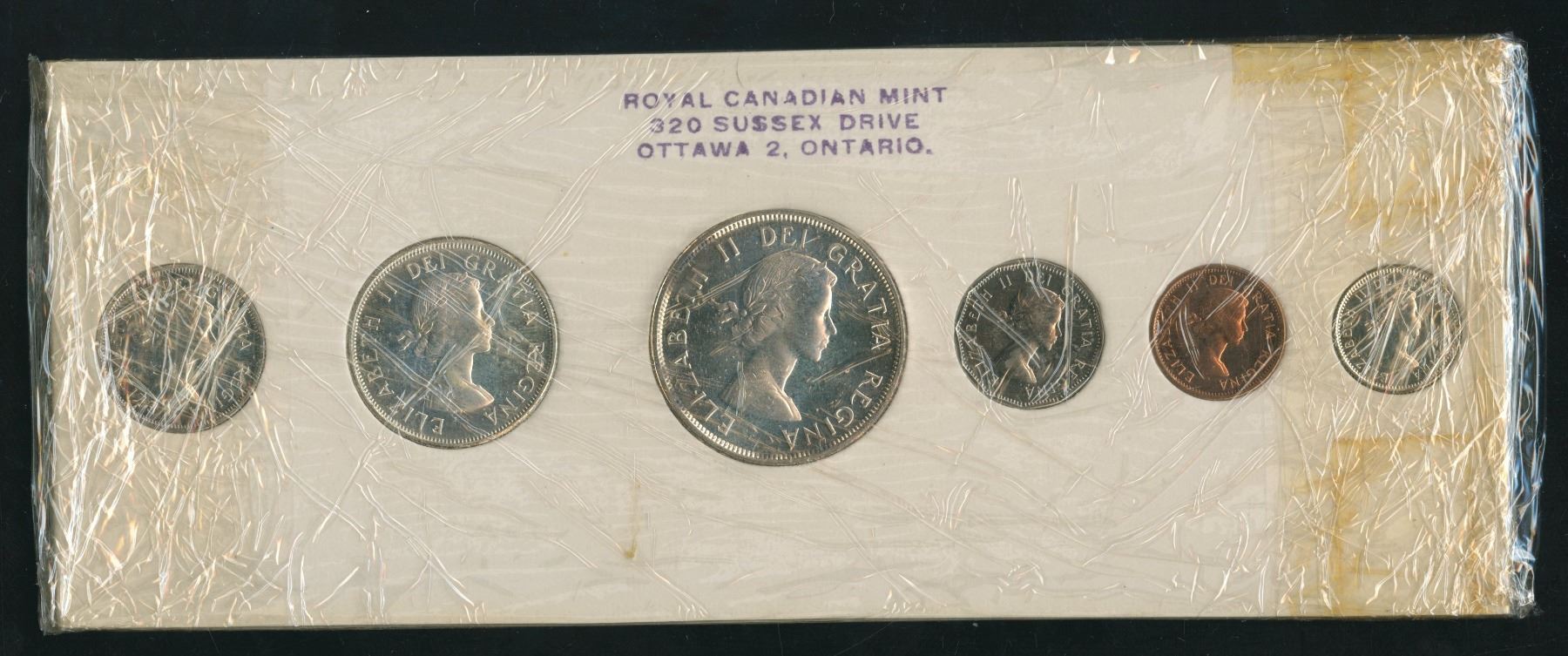 Pair of 1960 Royal Canadian Mint proof-like sets, with original mailing box, original invoice from the mint, and original sealed cardboards of issue. The cardboards are the scarcer 'Stamp Four' type (blue text). This set is unusual, as each set is individually wrapped in cellophane, and then both sets were wrapped together for shipping.