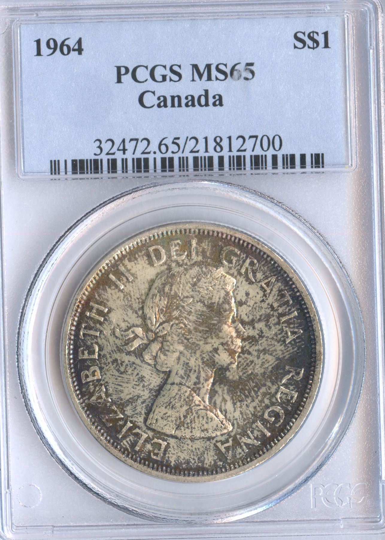 PCGS MS65, cross graded with ICCS MS65. Toned in shades of gray, blue, and gold.