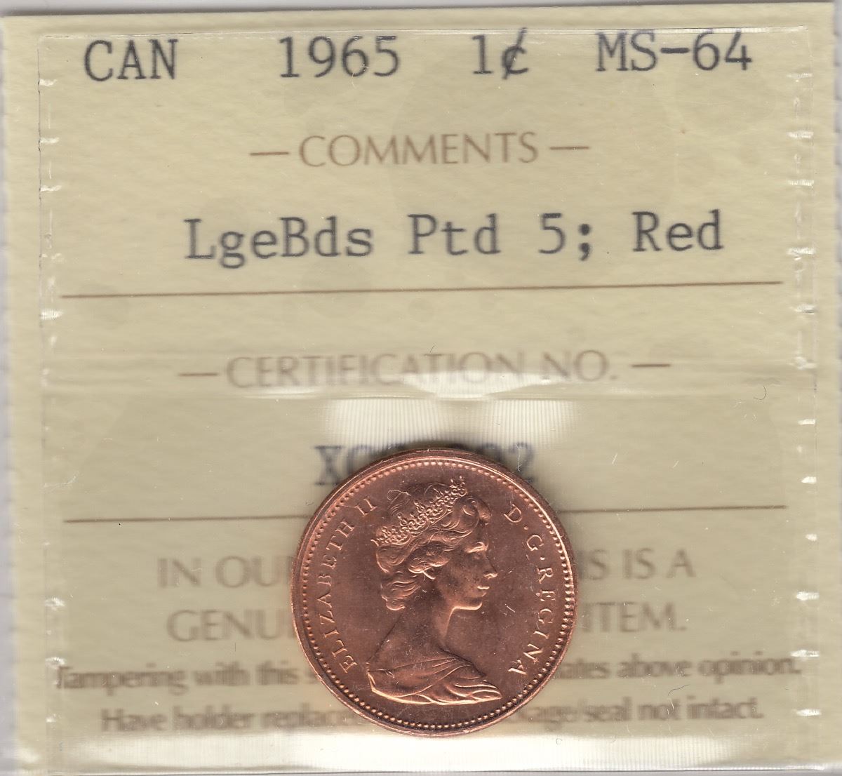 1965 One Cent - ICCS MS-64, large beads, pointed 5; Red.