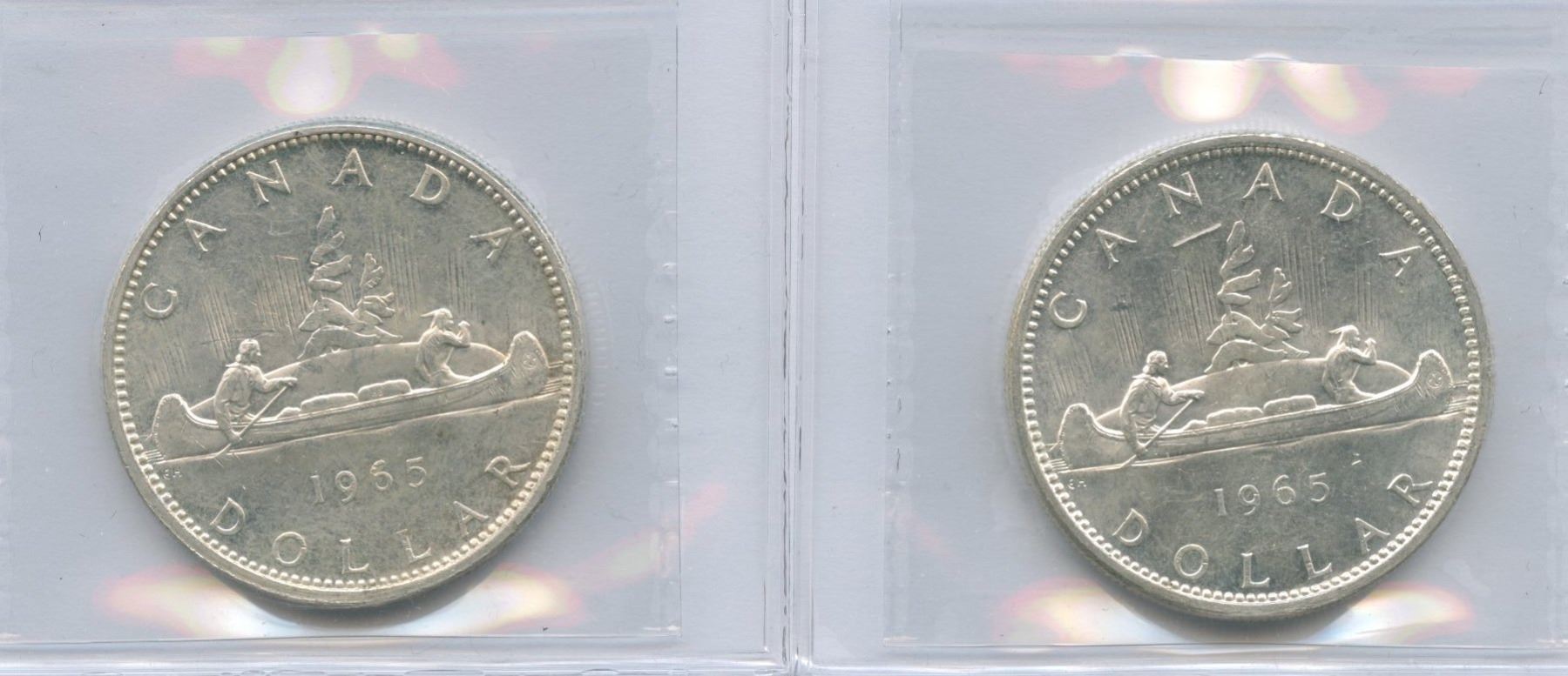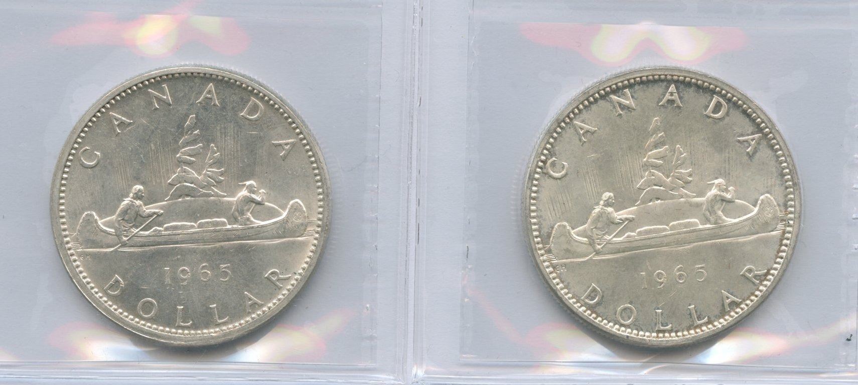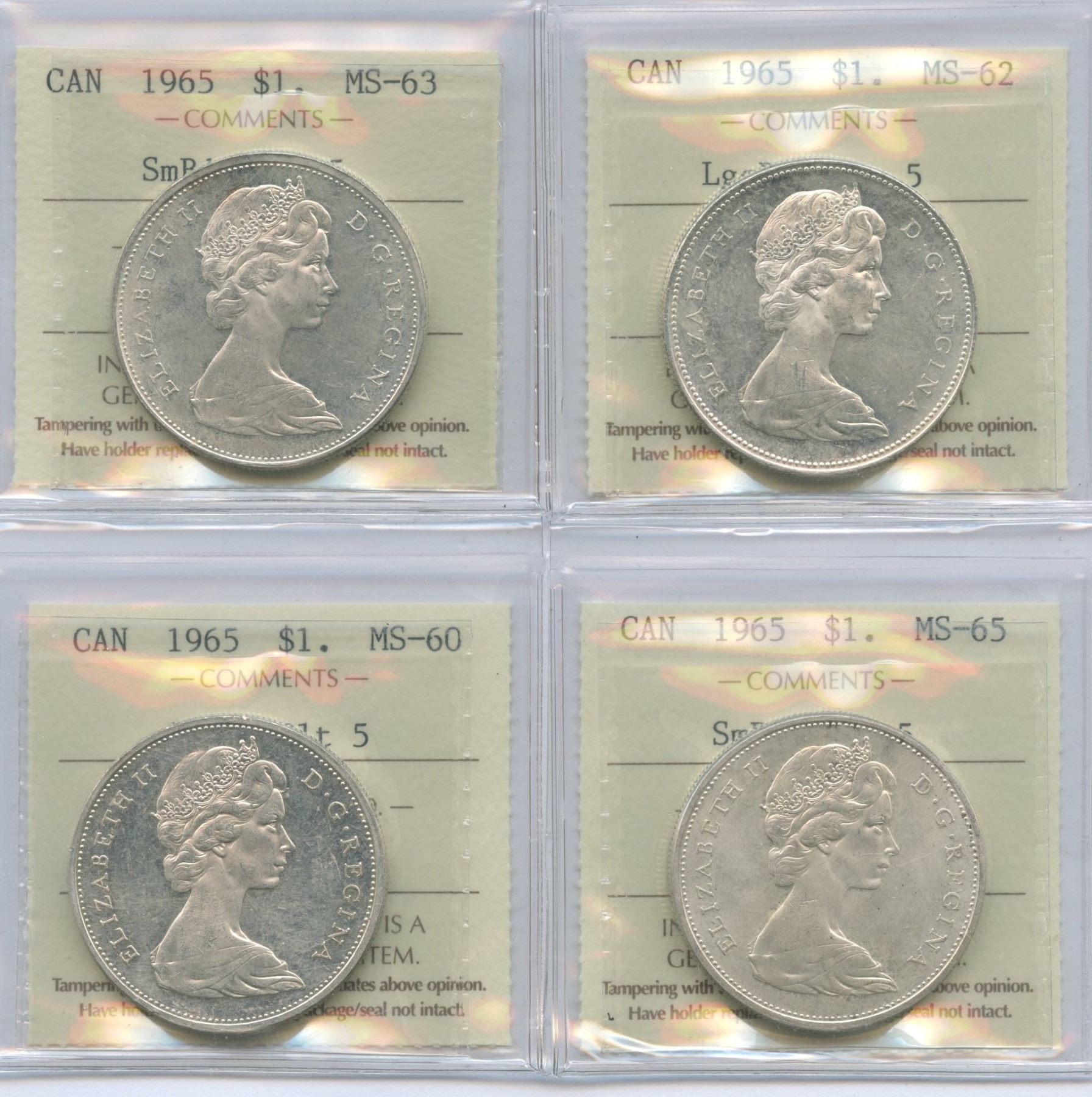 1965 Silver Dollars - Lot of 4 ICCS Graded - Includes: 1965 MS-63, Small Beads Blunt 5. 1965 MS-60, Small Beads Blunt 5. 1965 MS-62, Large Beads Blunt 5. 1965 MS-65, Small Beads Pointed 5. 4 pcs.