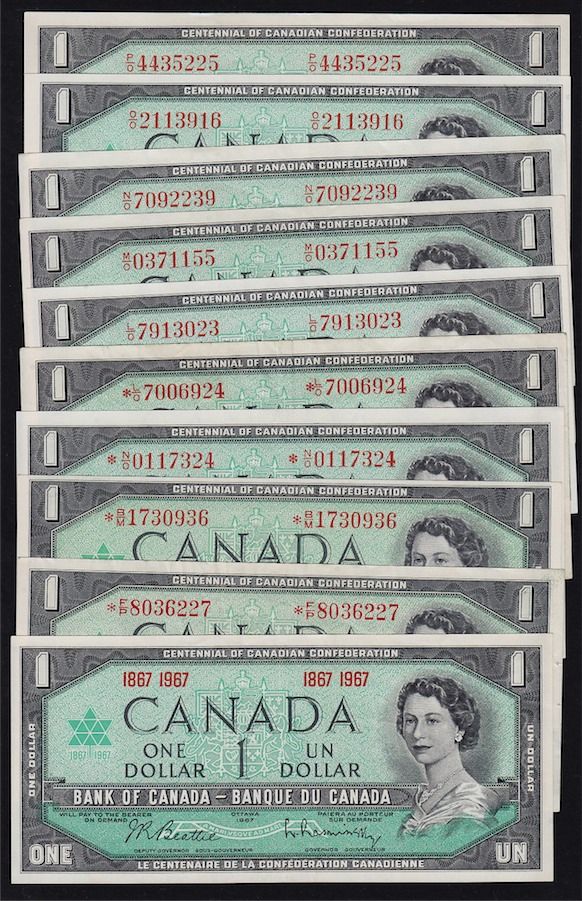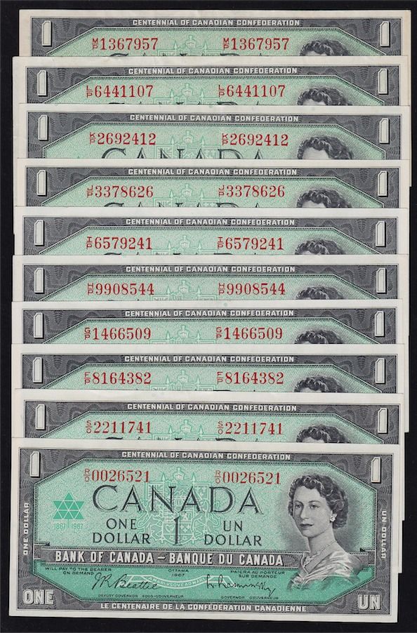 1967 Bank of Canada $1 Complete Prefix Collection Includes Replacement notes, conditions vary from F-UNC, viewing is recommended. 20 Pcs.
