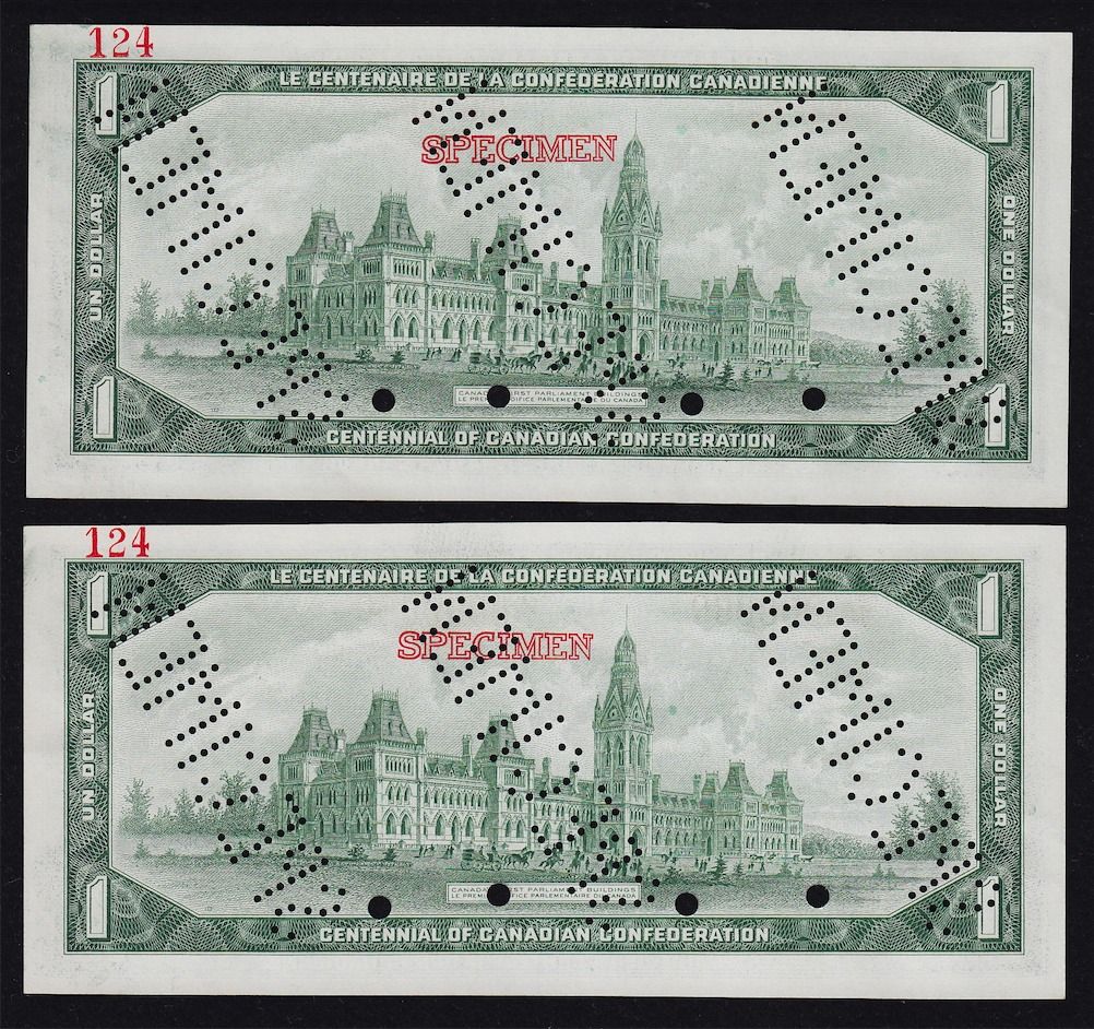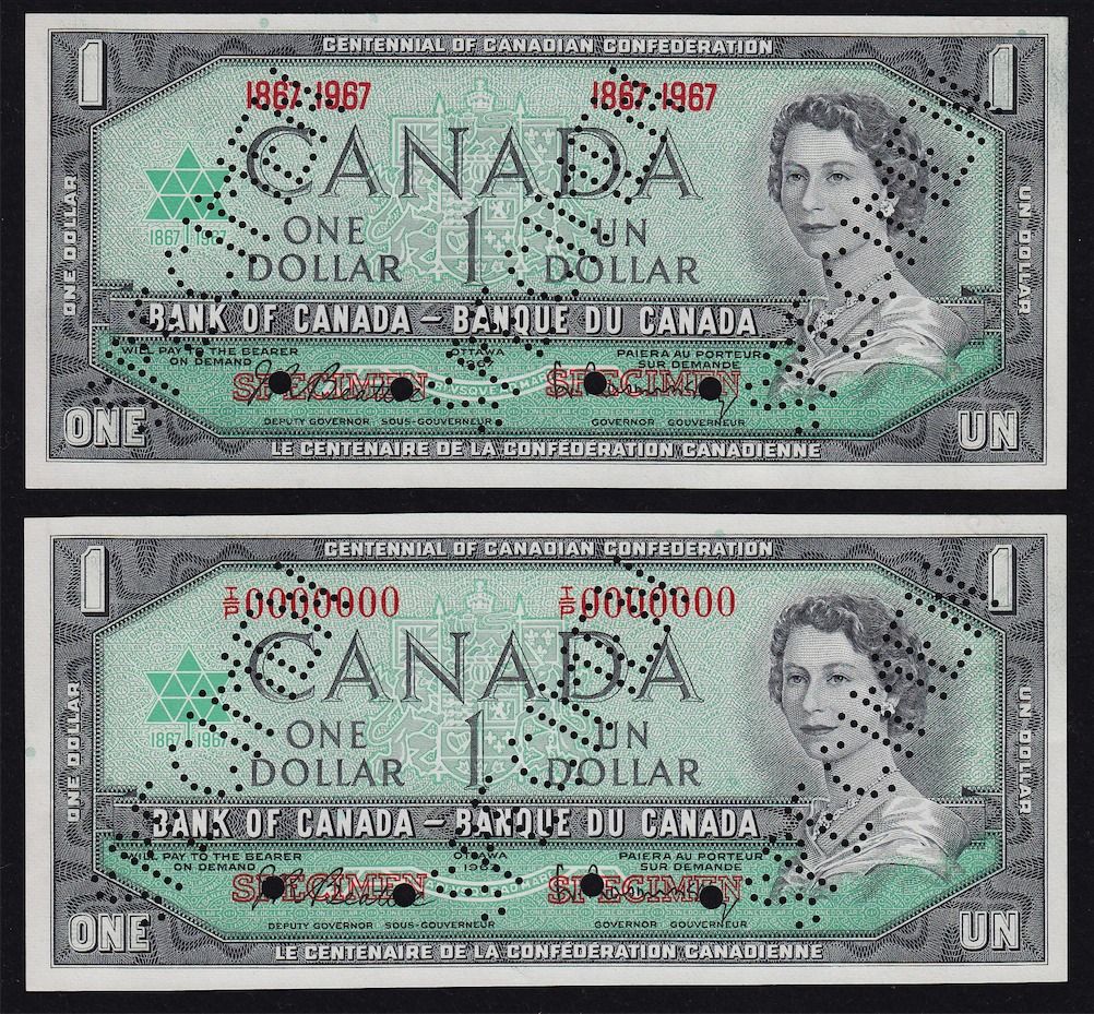 1967 Bank of Canada $1 Pair - With and Without serial numbers, in choice uncirculated conditions. Set number 124 of the 246 sold. 2 Pcs.