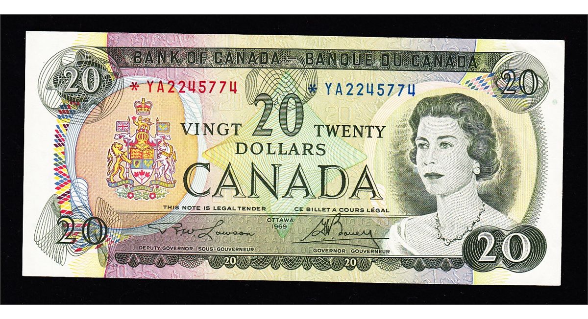 1969 Bank of Canada $20 Replacement Note - CH BC-50bA, EF, S/N:*YA2245774.