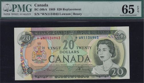 1969 Bank of Canada $20 Replacement Note - CH BC-50bA, PMG Gem UNC 65 EPQ, S/N:*WN1134943.
