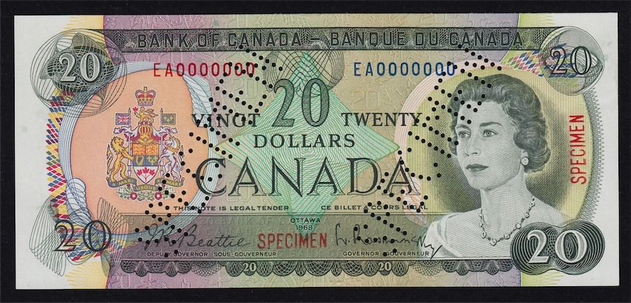 1969 Bank of Canada $20 Specimen. BC-50aS, UNC, S/N:479 of 640.