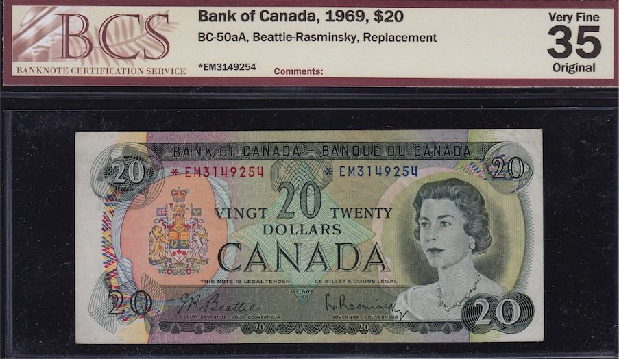 1969 Bank of Canada $20. BC-50aA, BCS Very Fine 35 Original, Replacement, S/N:*EM3149254.