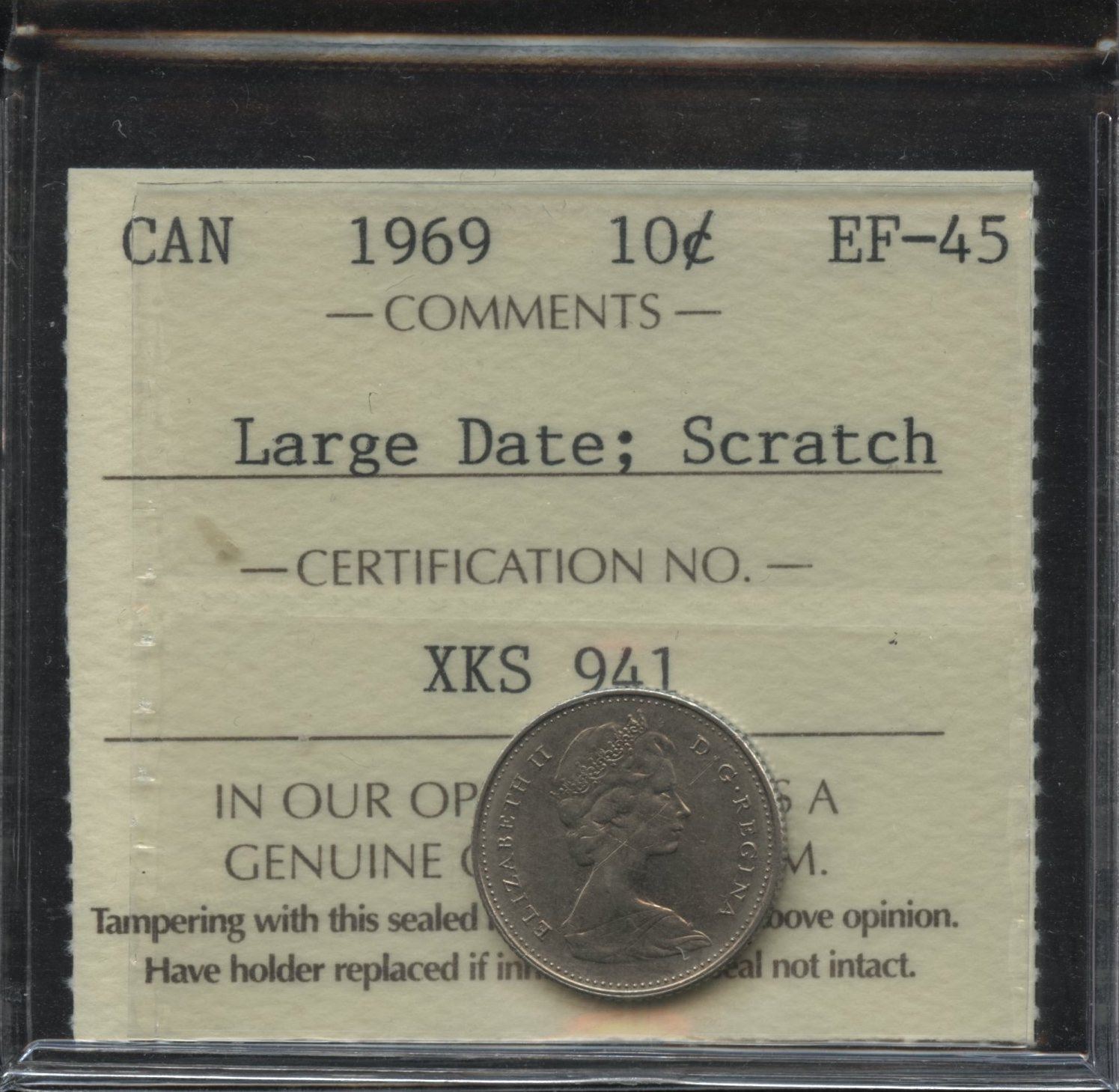 ICCS EF-45. Large Date. Scratch. Incredibly rare 1969 Large Date ten cents. A coin so rare that its very existence was not confirmed until nine years after it was struck! The 1969 10 cent coin has become Canada's great modern rarity.