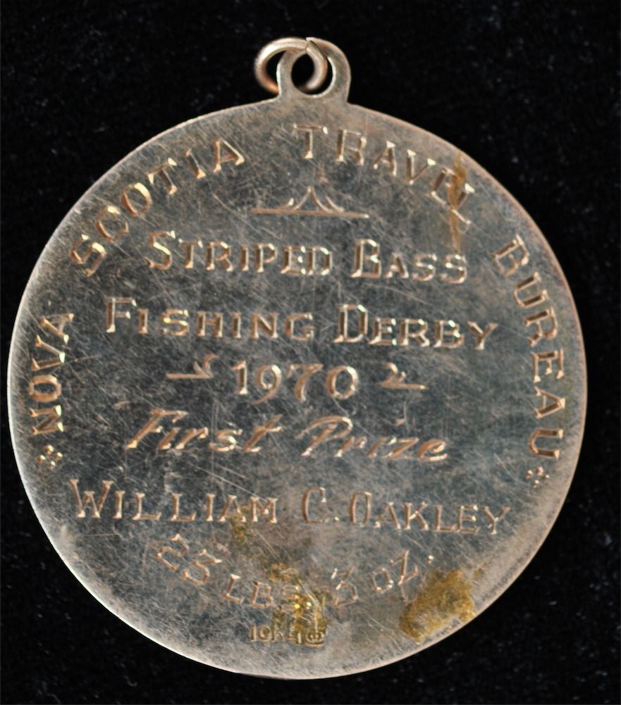 1970 Nova Scotia Striped Bass Fishing Derby First Prize Gold Medal - Issued by the NS Travel Bureau, fully engraved and awarded to William C. Oakley. 10k, 14.5 grams.
