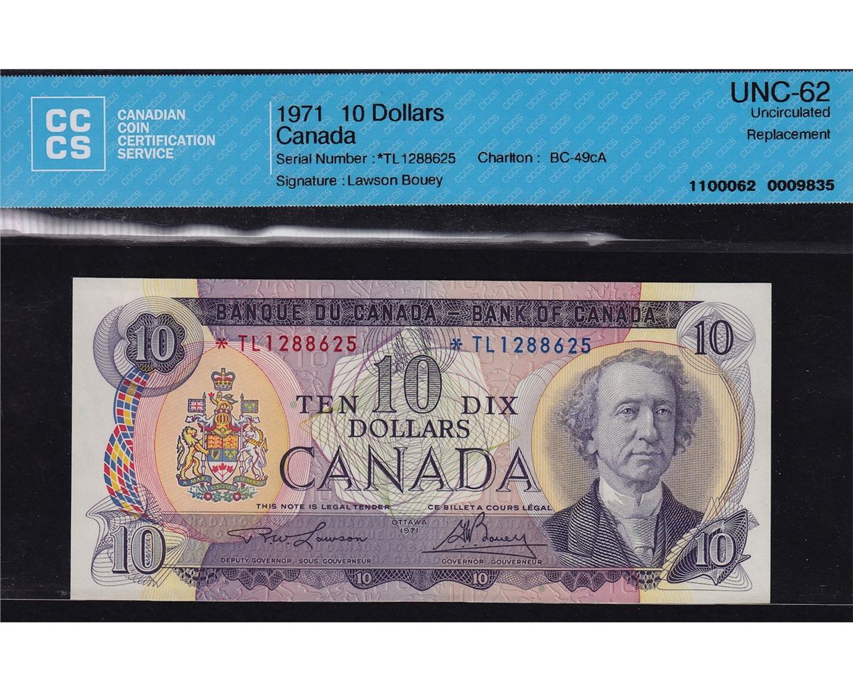 1971 Bank of Canada $10 Replacement - BC-49cA CCCS UNC-62 S/N:*TL1288625.