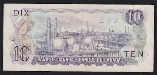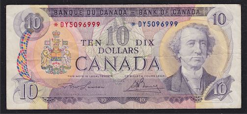 1971 Bank of Canada Ten Dollars Replacement - CH BC-49cA. VF with writing on back. Charlton states there is only one known. S/N: *DY5096999.