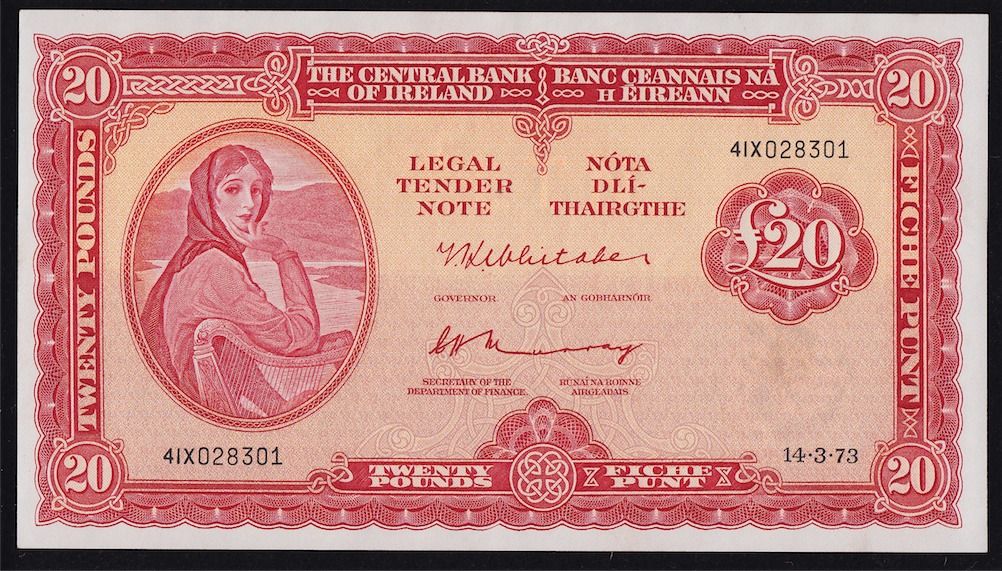 1973 Central Bank of Ireland Twenty Pounds - Pick #67b. Choice uncirculated, nice match for above note. S/N:41X028301.