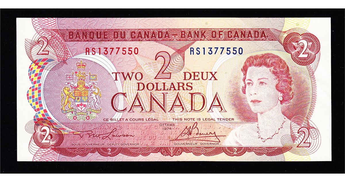1974 Bank of Canada $2 Test Note - CH BC-47aT, AU-Unc, S/N:RS1377550.