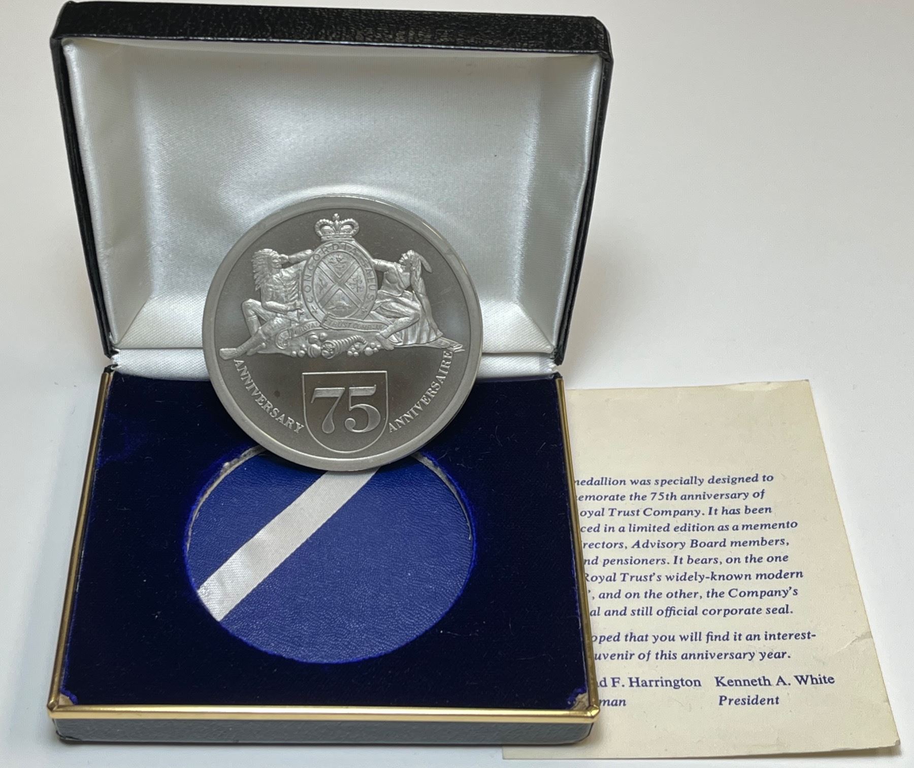 This medallion was struck for the 75th Anniversary of The Royal Trust Company, 1899-1974. Housed in Original Box of Issue with description card. Medal bears the Royal Trust logo and on the other side, the Company's original and still official corporate seal. Nickel. 64mm. 131.0 grams.