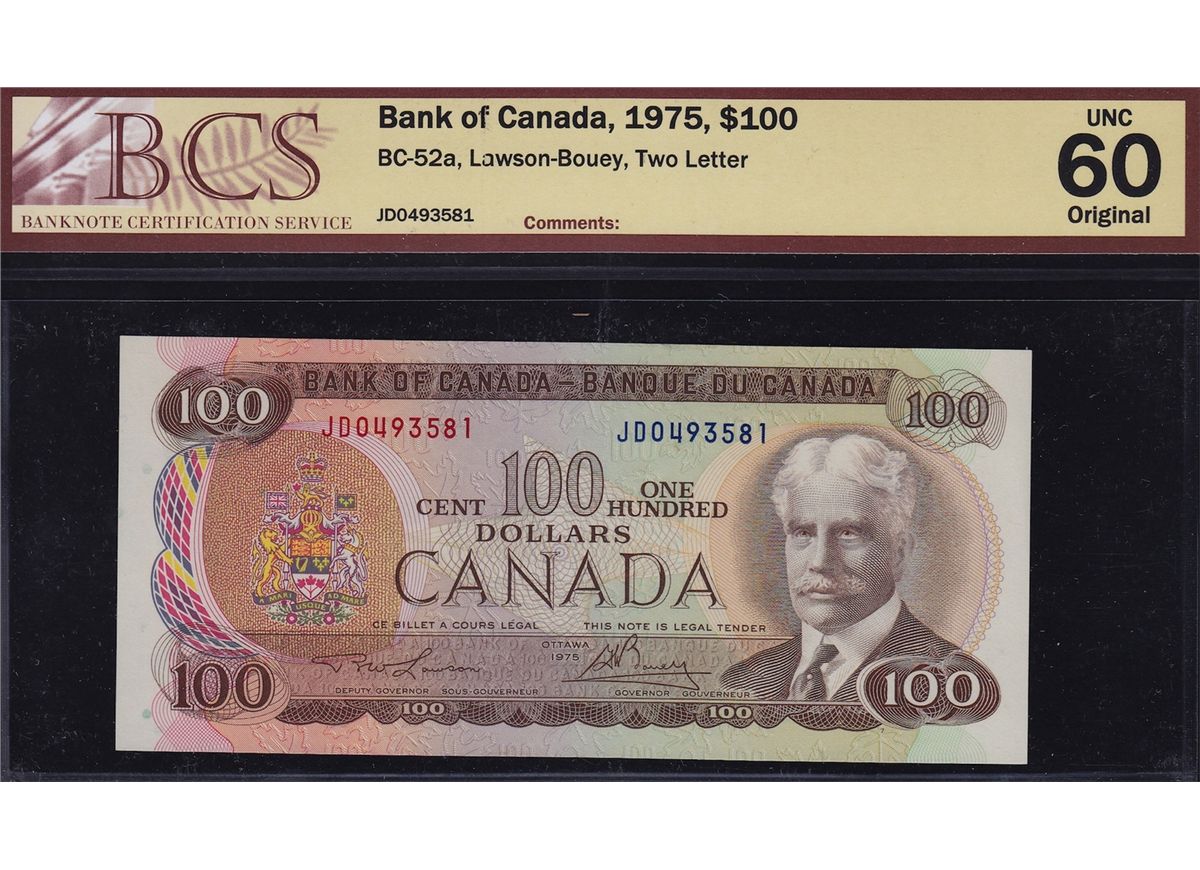 1975 Bank of Canada $100 - BC-52a BCS UNC60 Original. S/N:JD0493581.