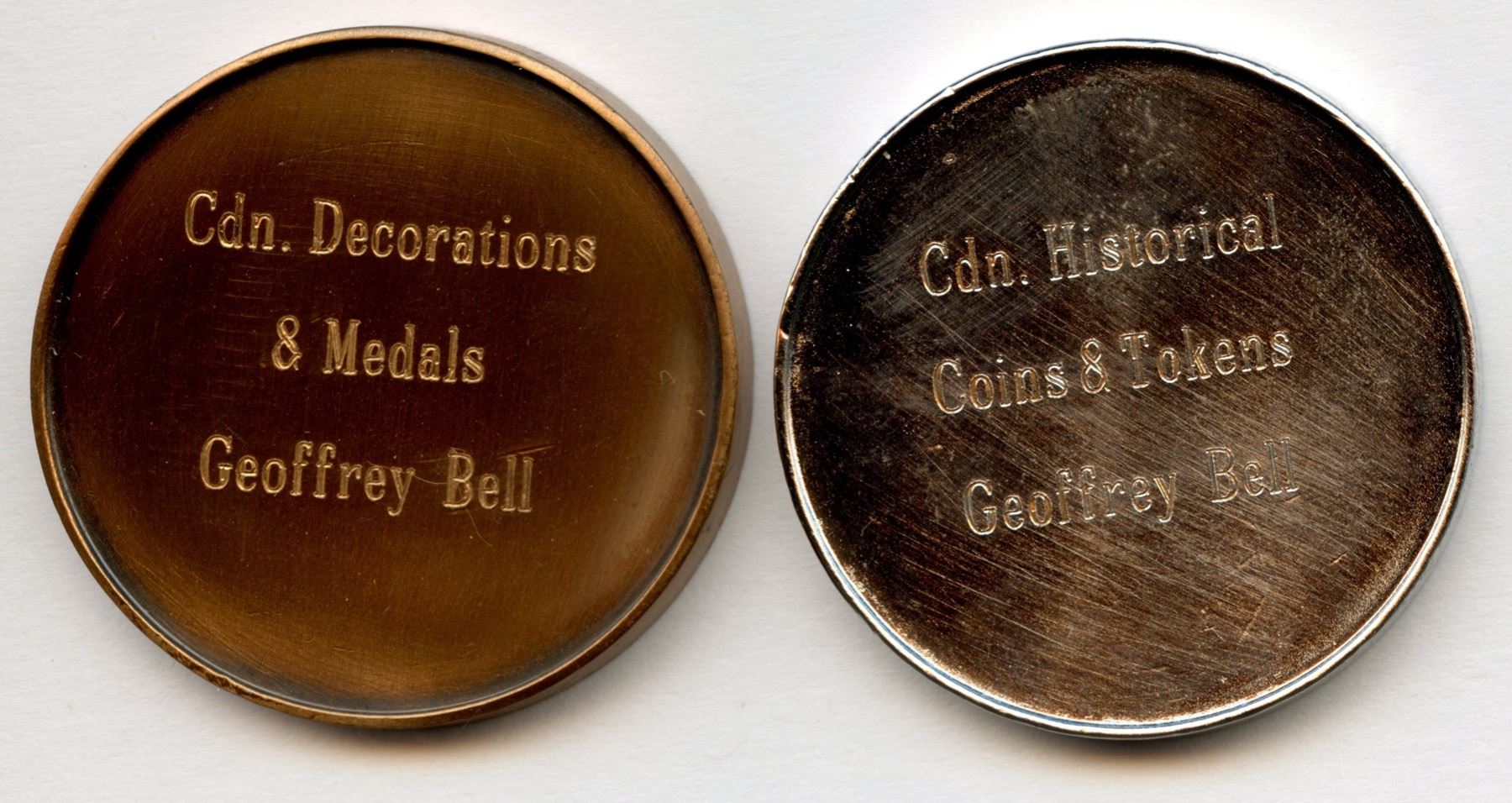 Both presented to Geoffrey Bell. Produced in copper, Cdn. Decorations & Medals and Canadian Historical Coins & Tokens in cupro.