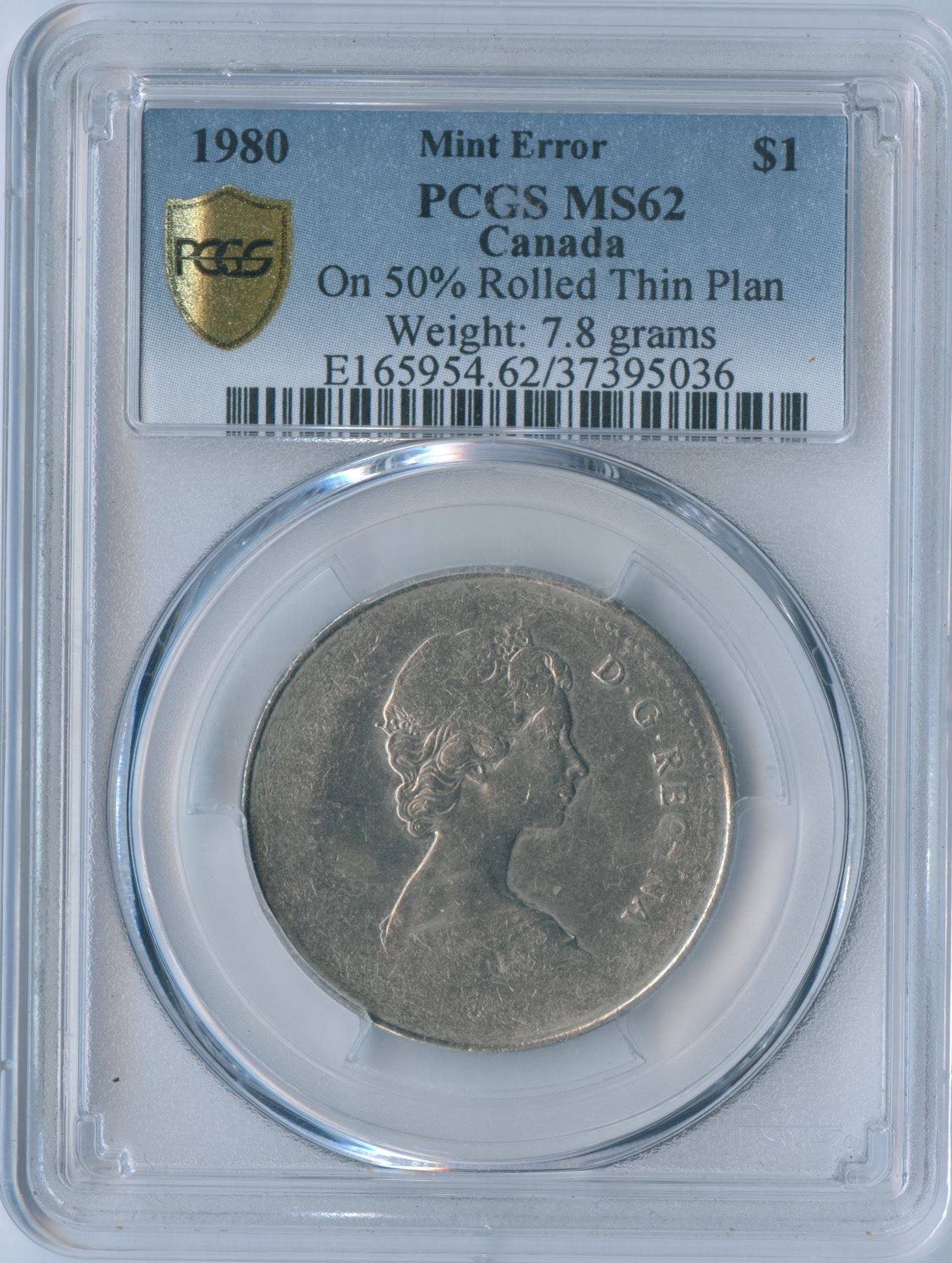 PCGS MS62. Weighing only 7.8 grams, accounting for a 50% rolled thin planchet error.