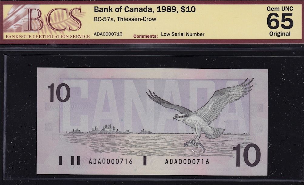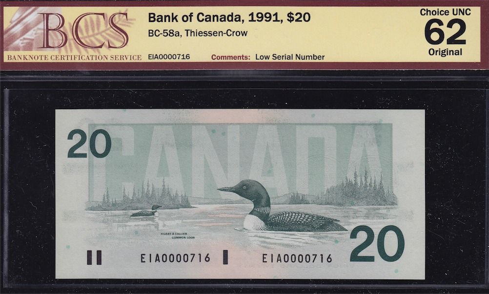 1986 - 1991 Bank of Canada Set Birds of Canada $2 - $20 - BC-55a - BC-61a, Birds of Canada $2 - $20 Matching Low Serial Numbered Set #716. All BCS UNC62-65, set of four notes.