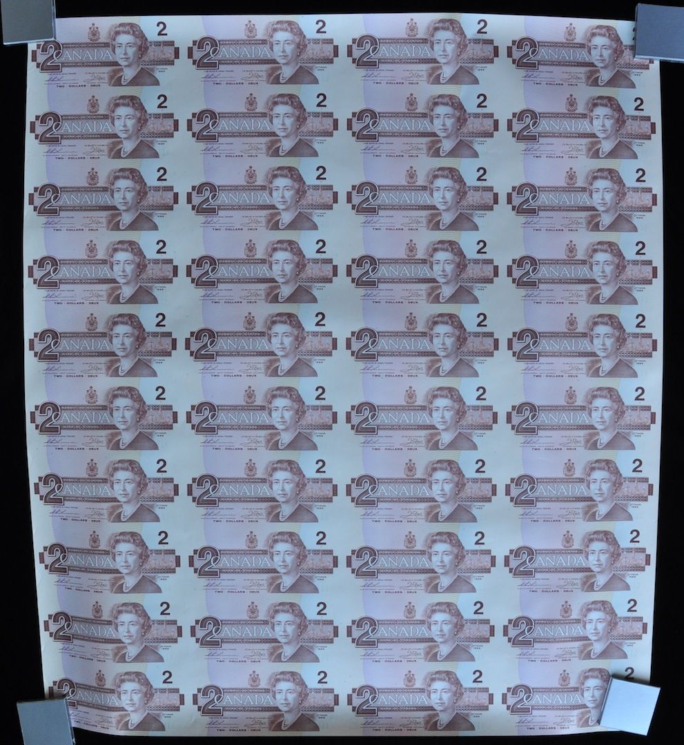 1986 Bank of Canada $2 Banknote Replacement Sheet - CH BC-55bA-i, Prefix EBX, signature Thiessen Crowe, AU.
