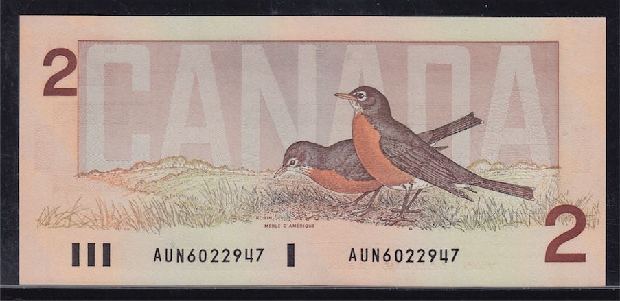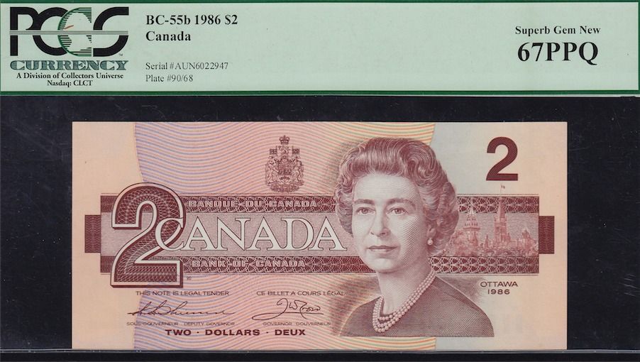 1986 Bank of Canada $2. BC-55b. PCGS Superb Gem UNC 67 PPQ. We rarely offer 67 conditions, transitional prefix. S/N:AUN6022947.
