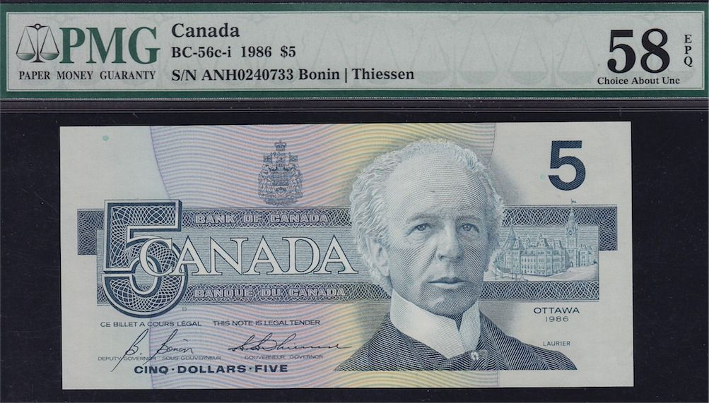 1986 Bank of Canada $5 - BC-56c-i PMG Choice AU58 EPQ S/N:ANH0240733.
