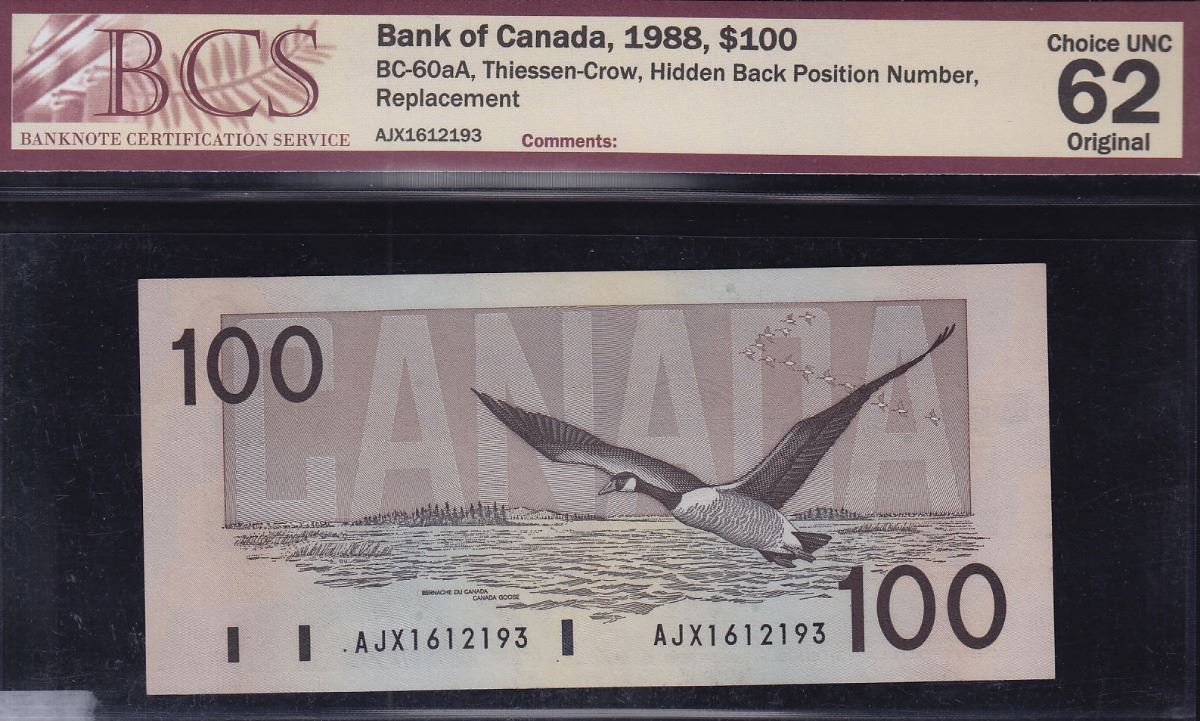 1988 Bank of Canada $100 Replacement - BC-60aA. BCS Choice UNC 62 Original. S/N:AJX1612193.