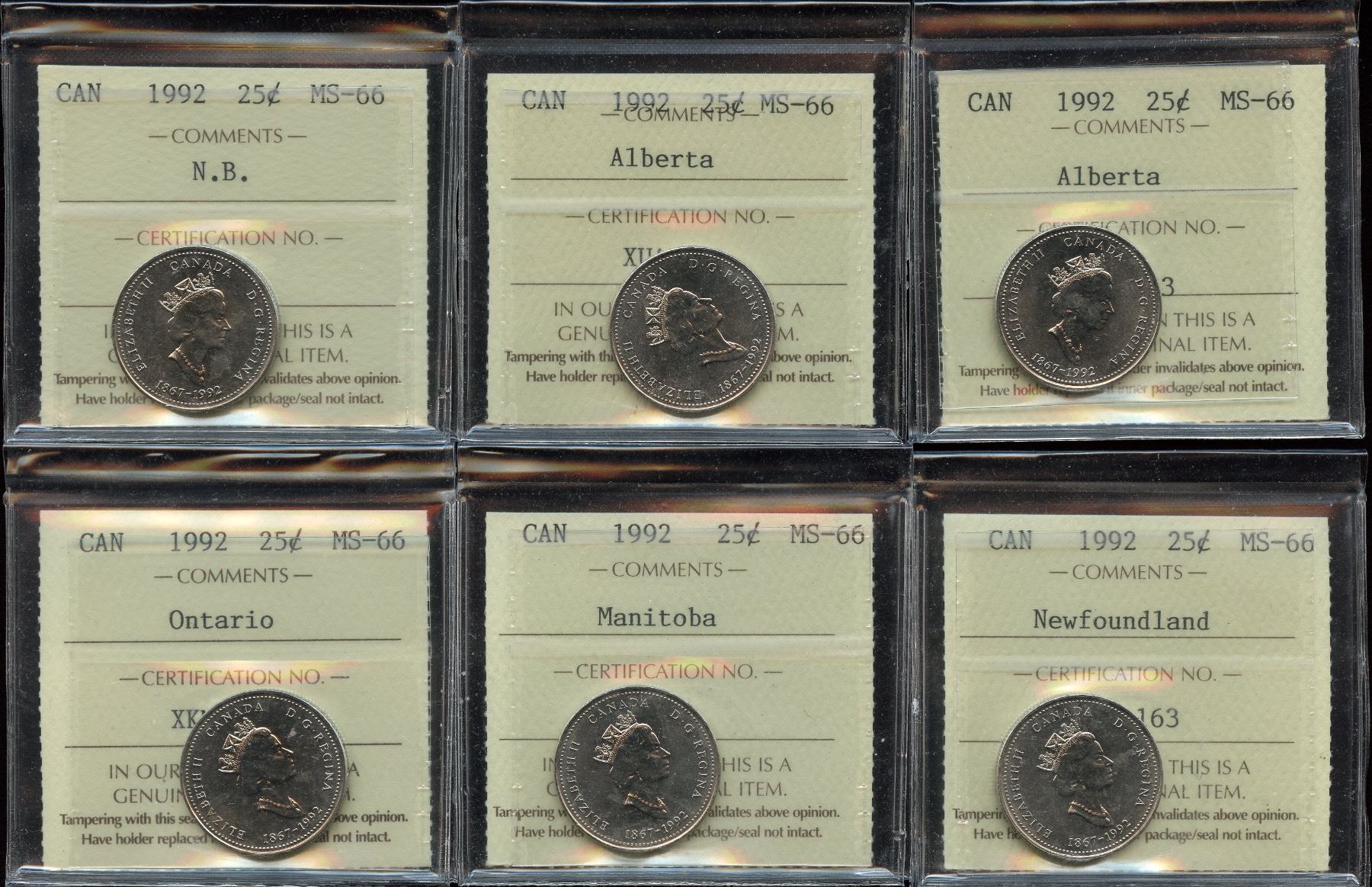 Includes: New Brunswick, 2 x Alberta, Ontario, Manitoba, Newfoundland. All ICCS graded MS-66. 6 Pcs.