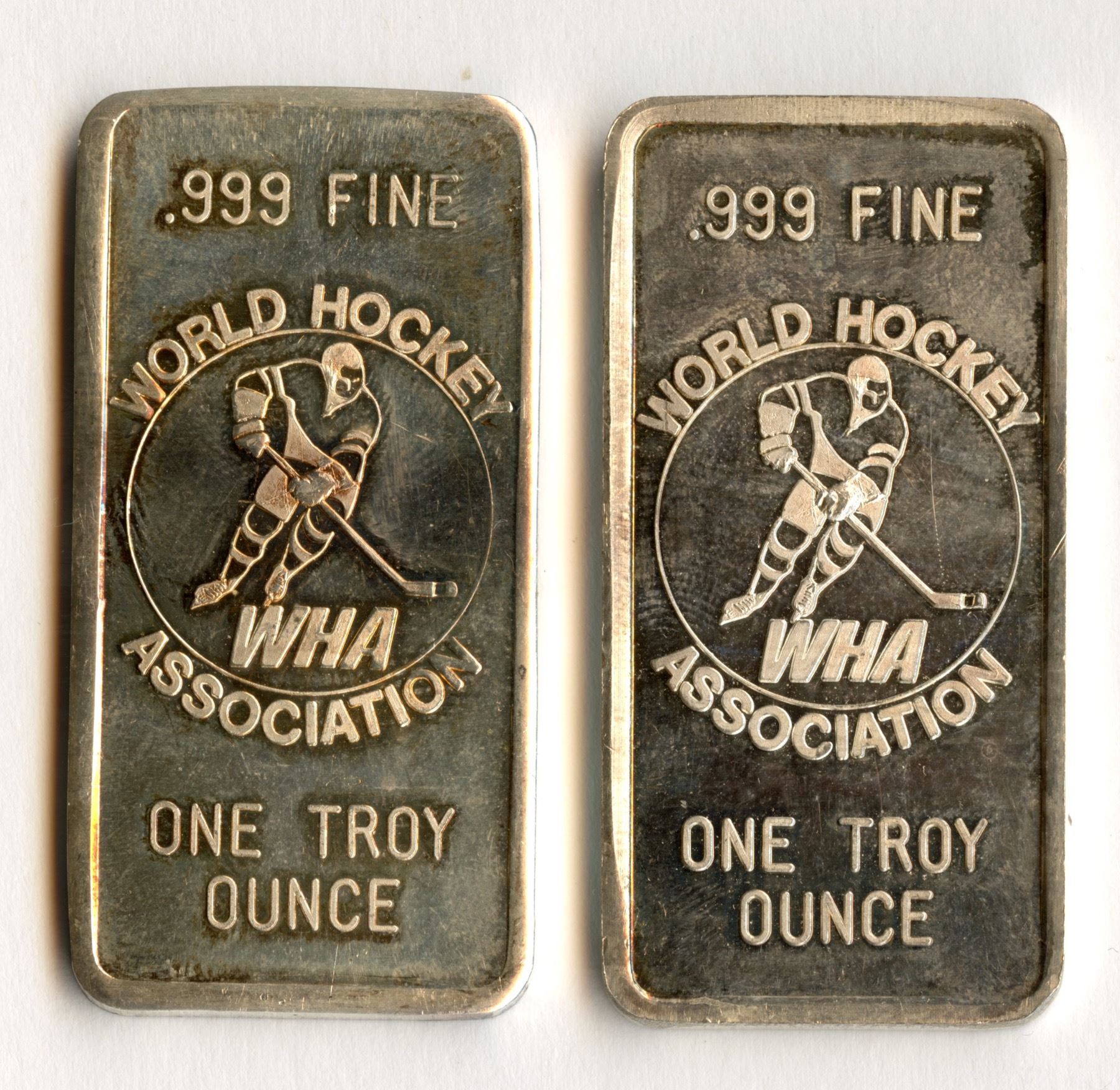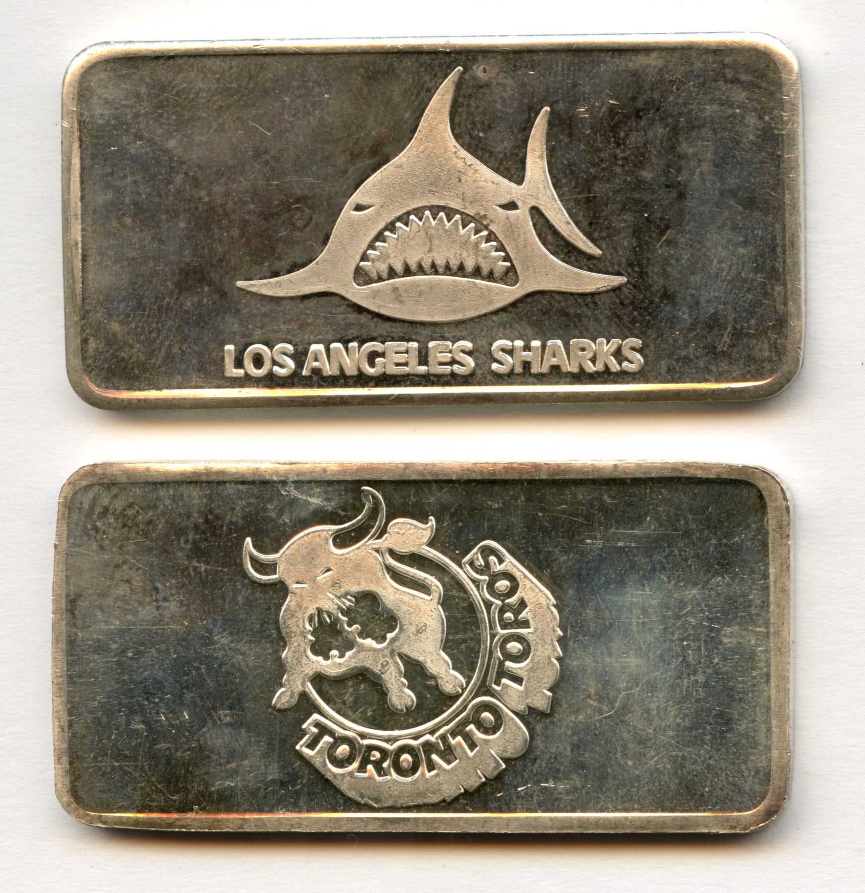 These .999 fine silver art bars in this table were minted in 1974 and 1975 by the Great Lakes Mint. These bars are part of a 14-bar set recognizing the teams in the World Hockey Association. These bars have serial and featuring team logo's of the "Toronto Toros" (#227) and the other "Los Angeles Sharks" (#348). It is believed that these are low mintage collector bars. (2)
