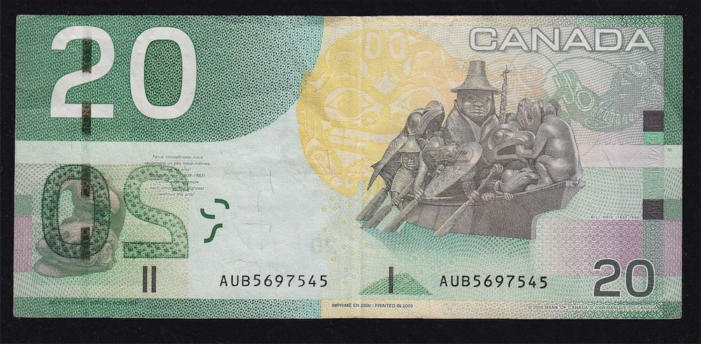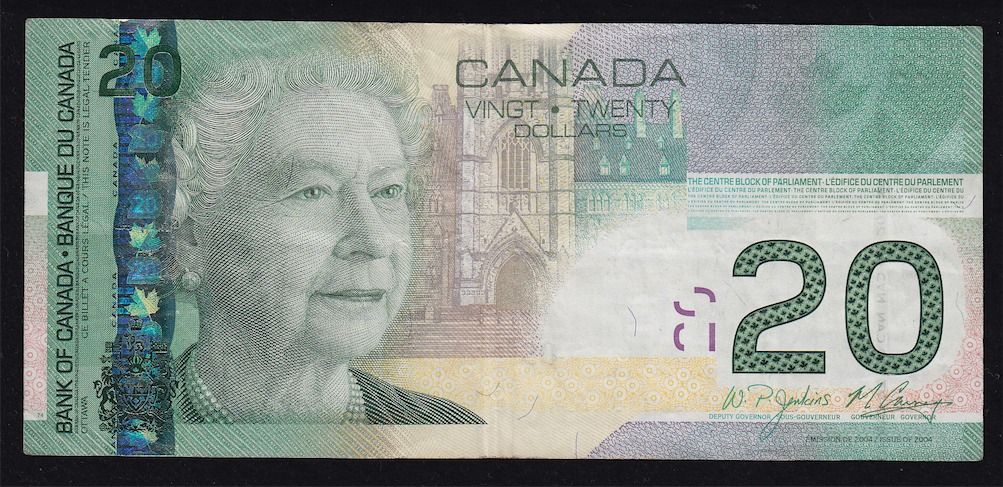 2004 Bank of Canada $20 Ink Transfer Error Note - Interesting ink transfer of "20" from the front to the back. VF. S/N:AUB5697545.