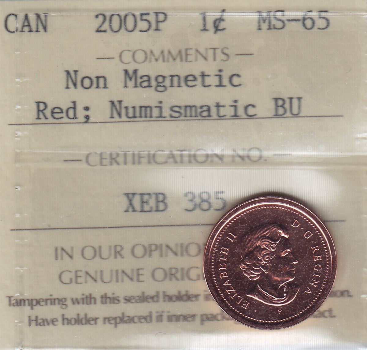 ICCS MS-65. Red. Copper Plated Zinc (Non-magnetic) type. Rare, a dozen known.