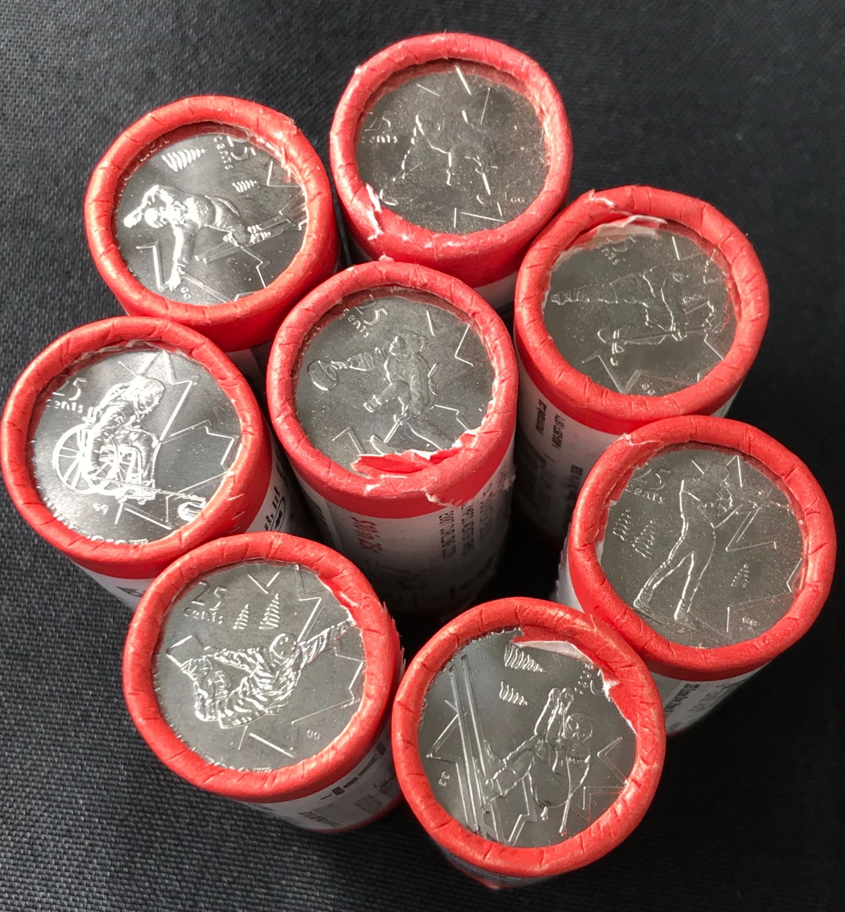 8 Roll Lot - Canadian Coin Rolls: 25¢ "Vancouver 2010" Olympic RCM Special Wrapped Roll of 40 pieces. 2007 Curling, 2007 Curling, 2007 Alpine Skiing, 2007 Biathlon, 2007 Ice Hockey, 2007 Paralympic Wheelchair Curling, 2008 Snowboarding, 2008 Freestyle Skiing.