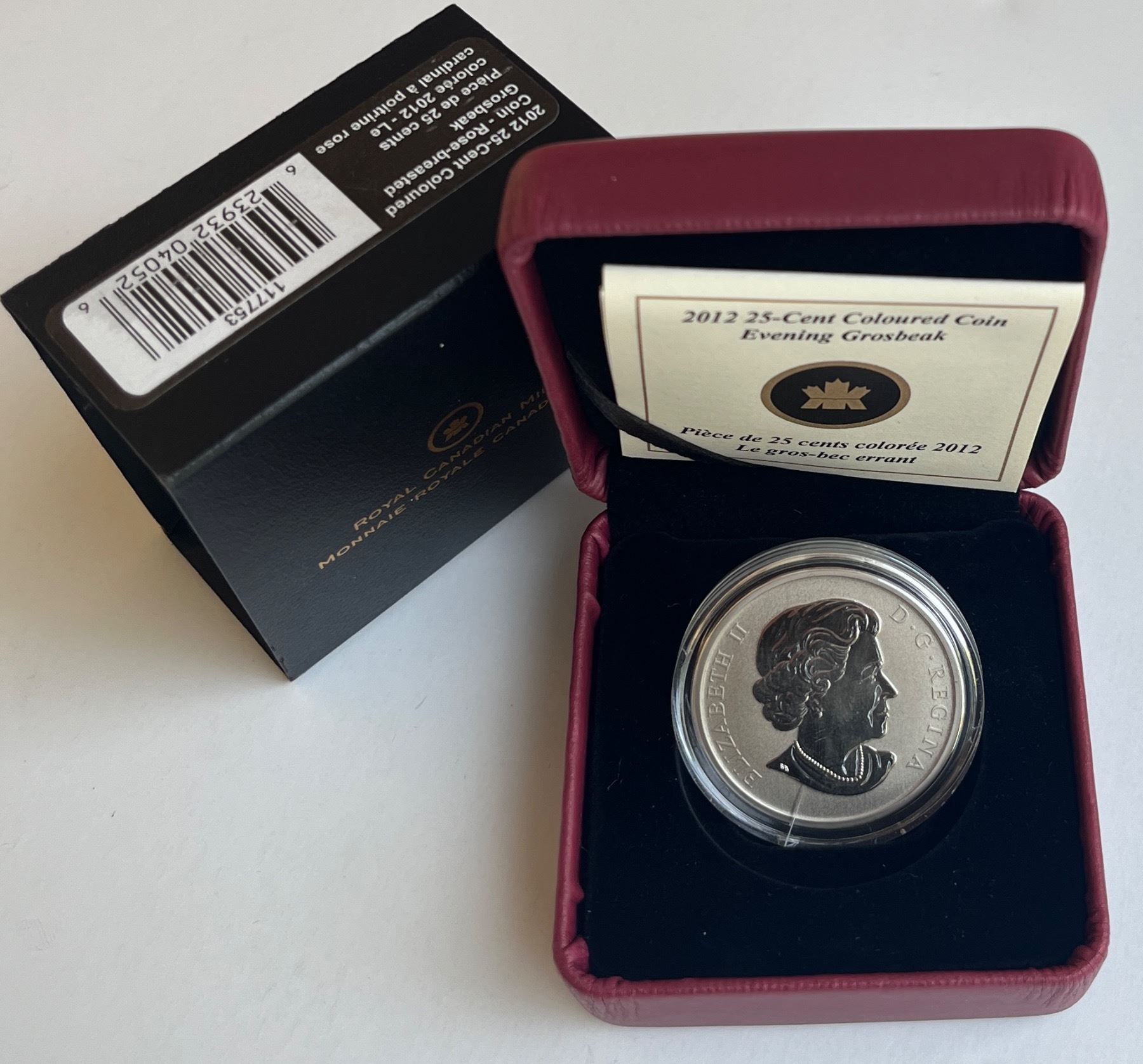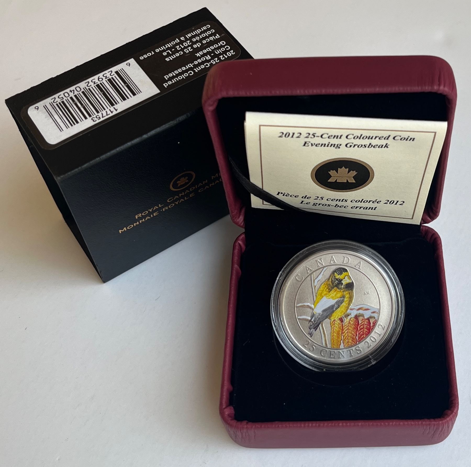 2012 Canada 25 cent Birds of Canada Evening Grosbeak. Mintage 20,000 with case, box, and COA RCM #117753