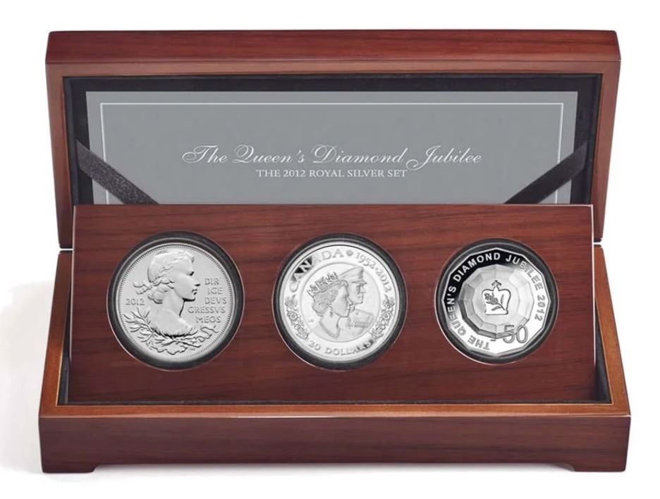 A trilogy of silver coins from British, Canada & Australian mints. (1) Sterling Silver UK Silver Proof 5 pound, 28.28 grams; (2) Fine Silver Canadian Proof $20, 31.39 grams; (3) Fine Silver Australian Proof 50 cent 18.24 grams. Fineness: 0.925/0.9999/0.999. Mintage 4,000. Bullion Weight: 2.437 Troy Ounces (total) Complete with COA's, Wooden display box and outer sleeve.