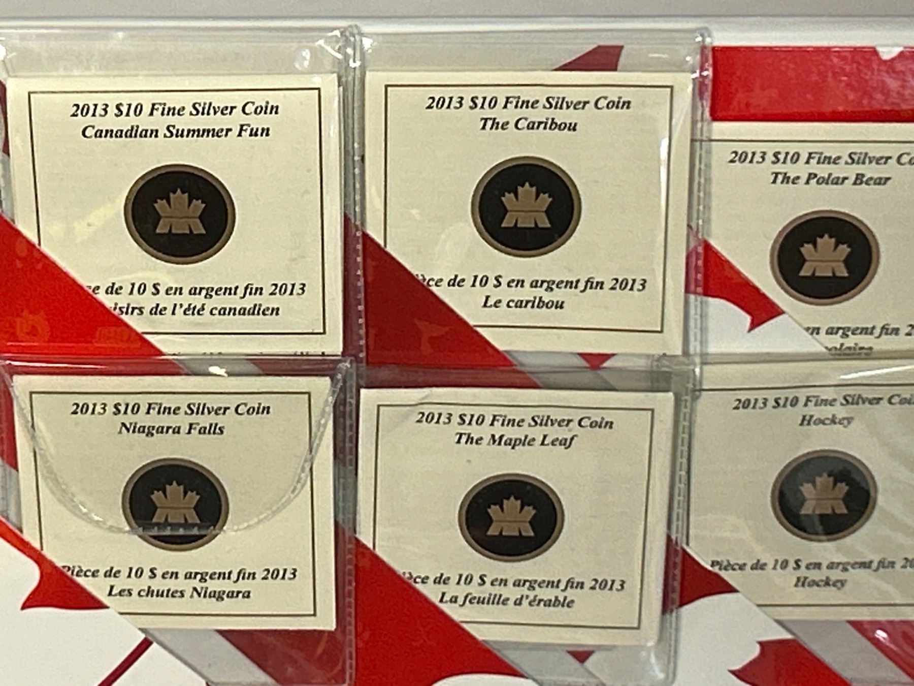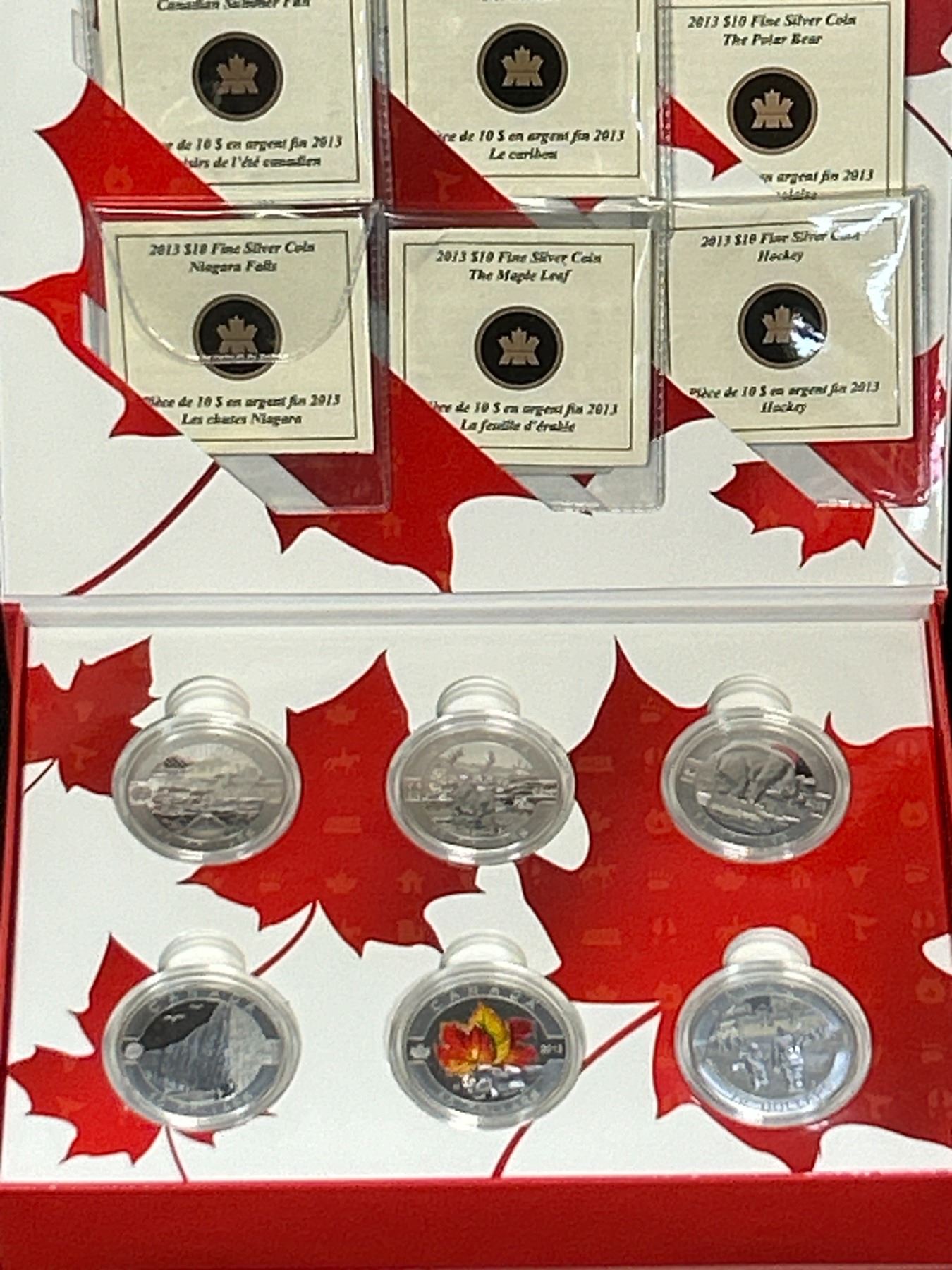 2013 $10 Fine Silver, .999. Includes: Niagara Falls - The Maple Leaf - The Caribou - Canadian Summer Fun - The Polar Bear - Hockey (No Tax). Mintage 40,000 In box with COA. RCM # 126374.