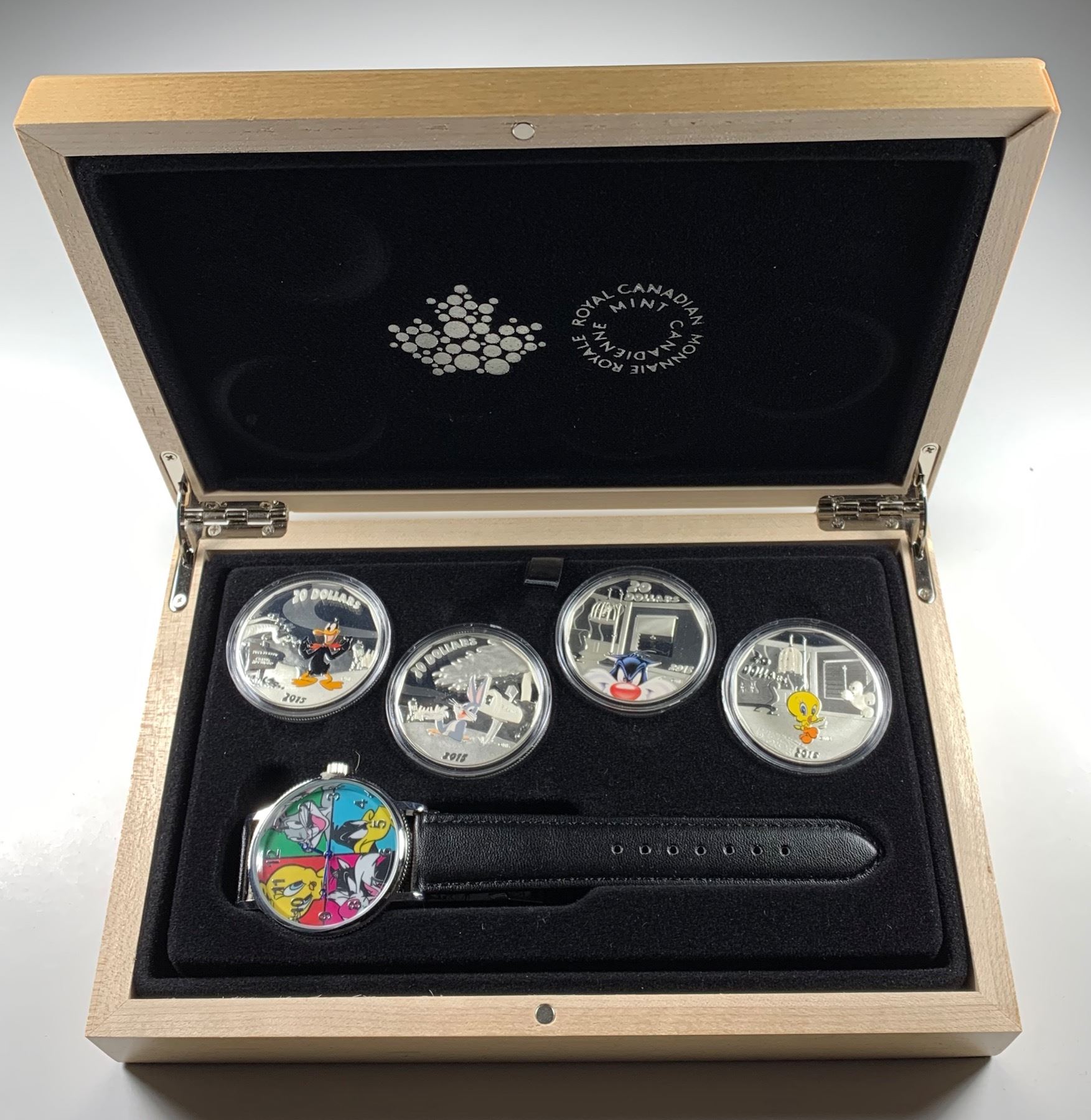 The 4 - 1oz coins include Tweety Bird, Sylvester the Cat, Daffy Duck & Bugs Bunny. Coins are encapsulated, and presented in a wooden box with custom beauty box and a wrist watch. Fine Silver - Mintage: 12,000 - With Box, sleeve, and COA - RCM 144879 - Issue price $419.95