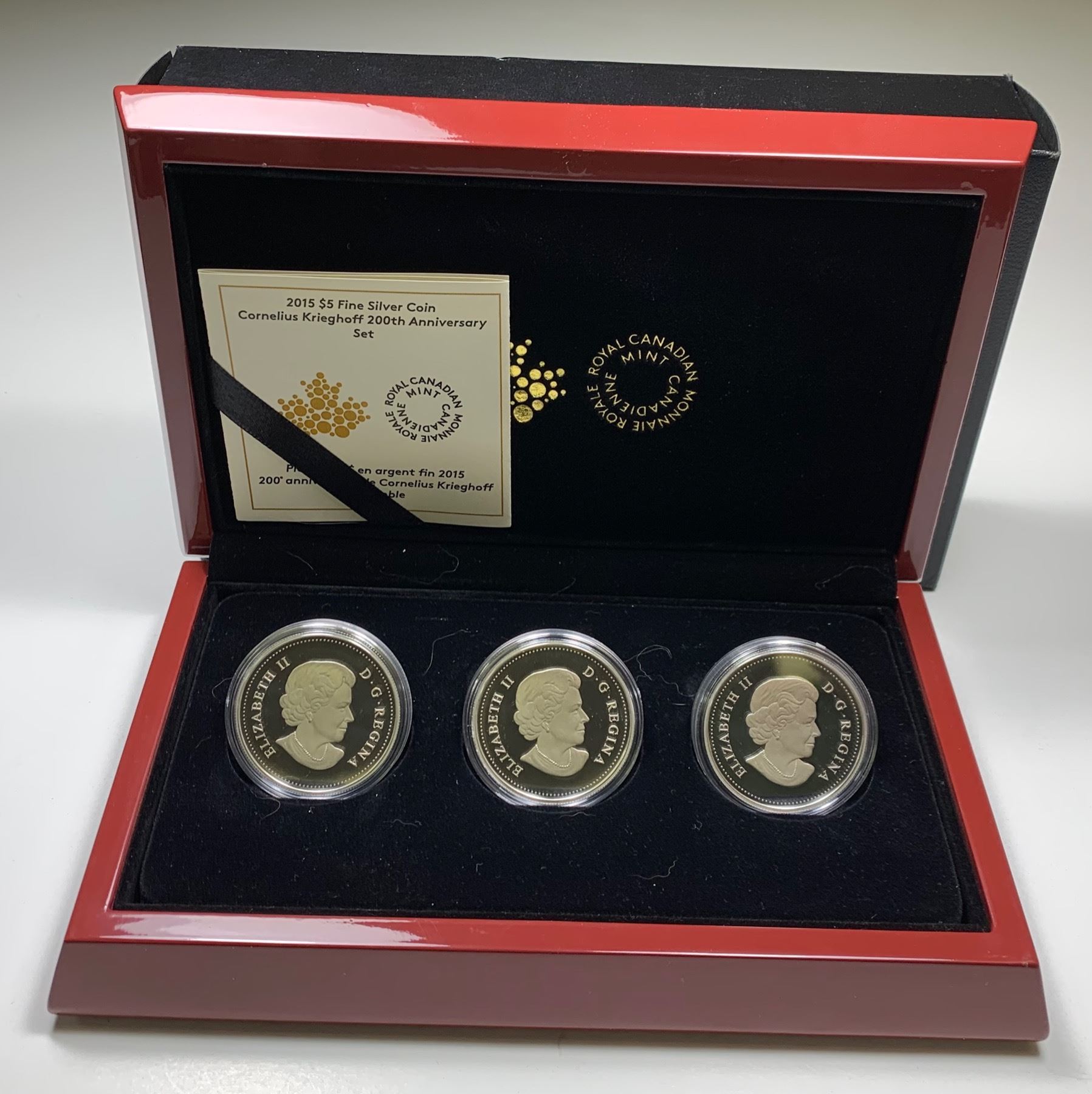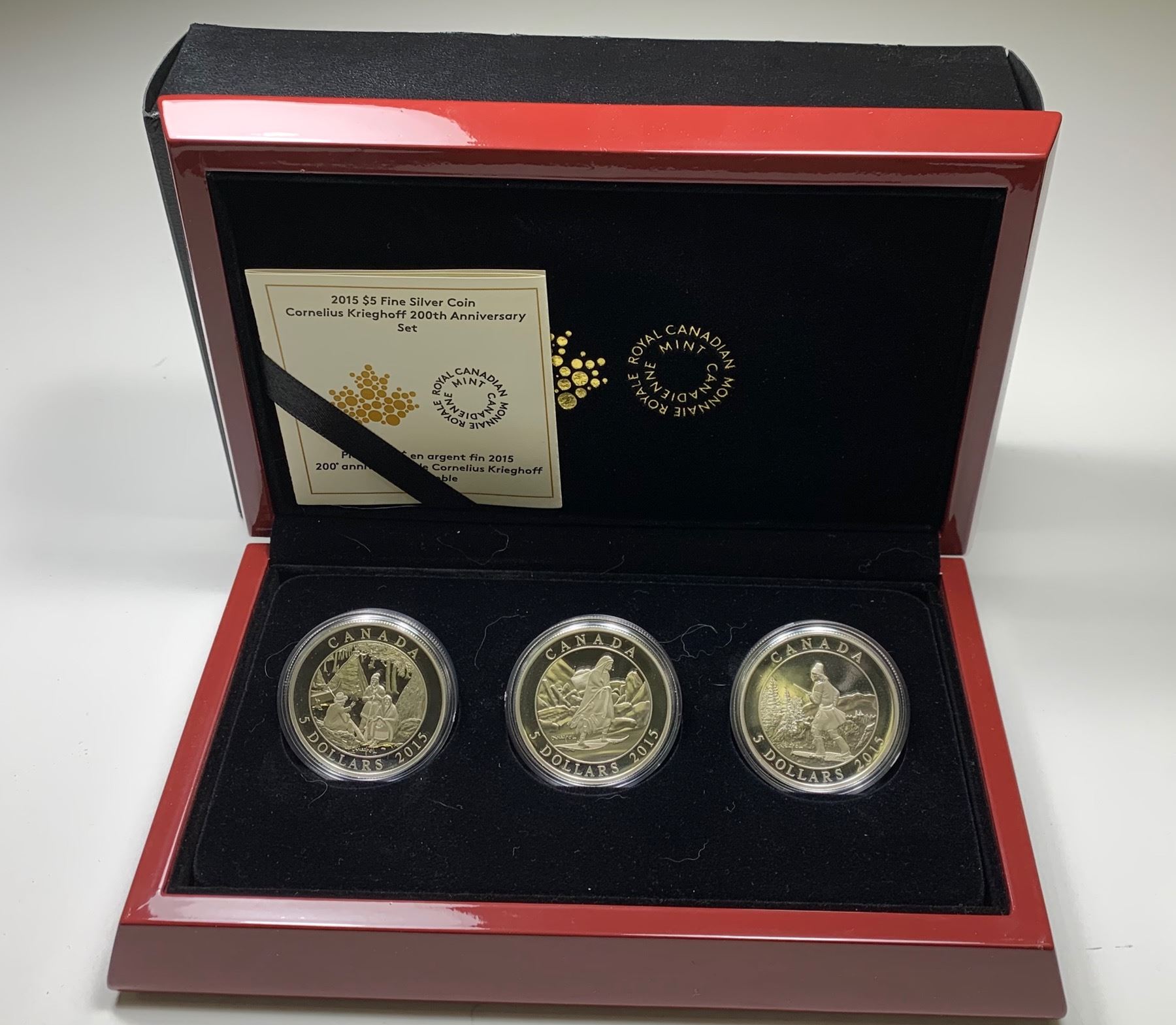 3-Coin set of pure silver coins, 23.17grms each. Featuring 3 famous works by 19th Century artist Cornelius Krieghoff. Indian Wigwam (1848); Moccasin Seller Crossing the St. Lawrence (1853-1863); Hunter in Winter (1855-1865). All in original cases with COAs. 3 Pcs.