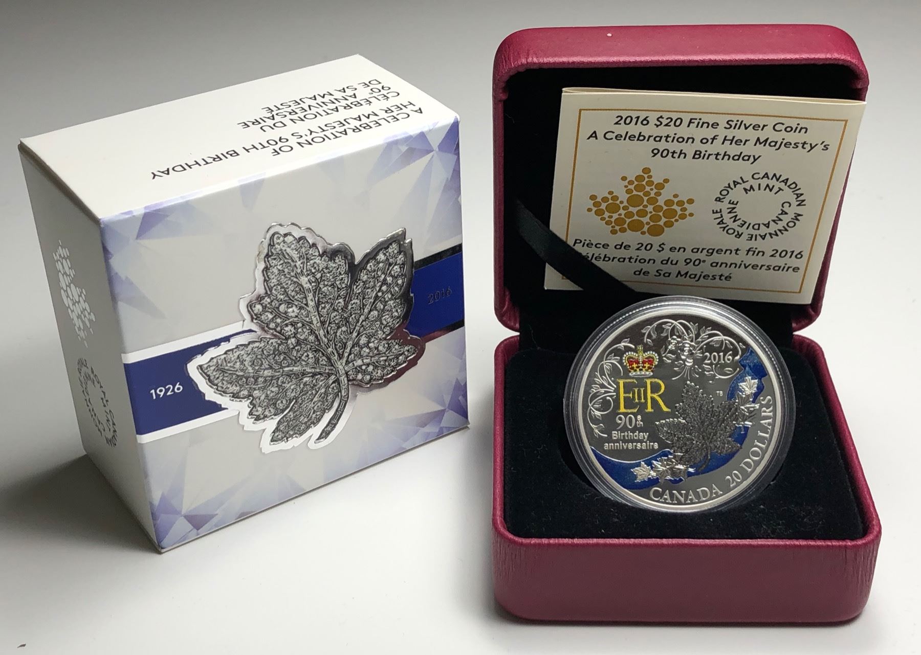 1 oz. Fine Silver Coloured Coin – A Celebration of Her Majesty's 90th Birthday – Mintage: 7,000 (2016) - Highly Desirable Coin, and one of the few RCM coins that have increased in value - With Box, sleeve and COA - RCM 153794 Issue Price $99.95