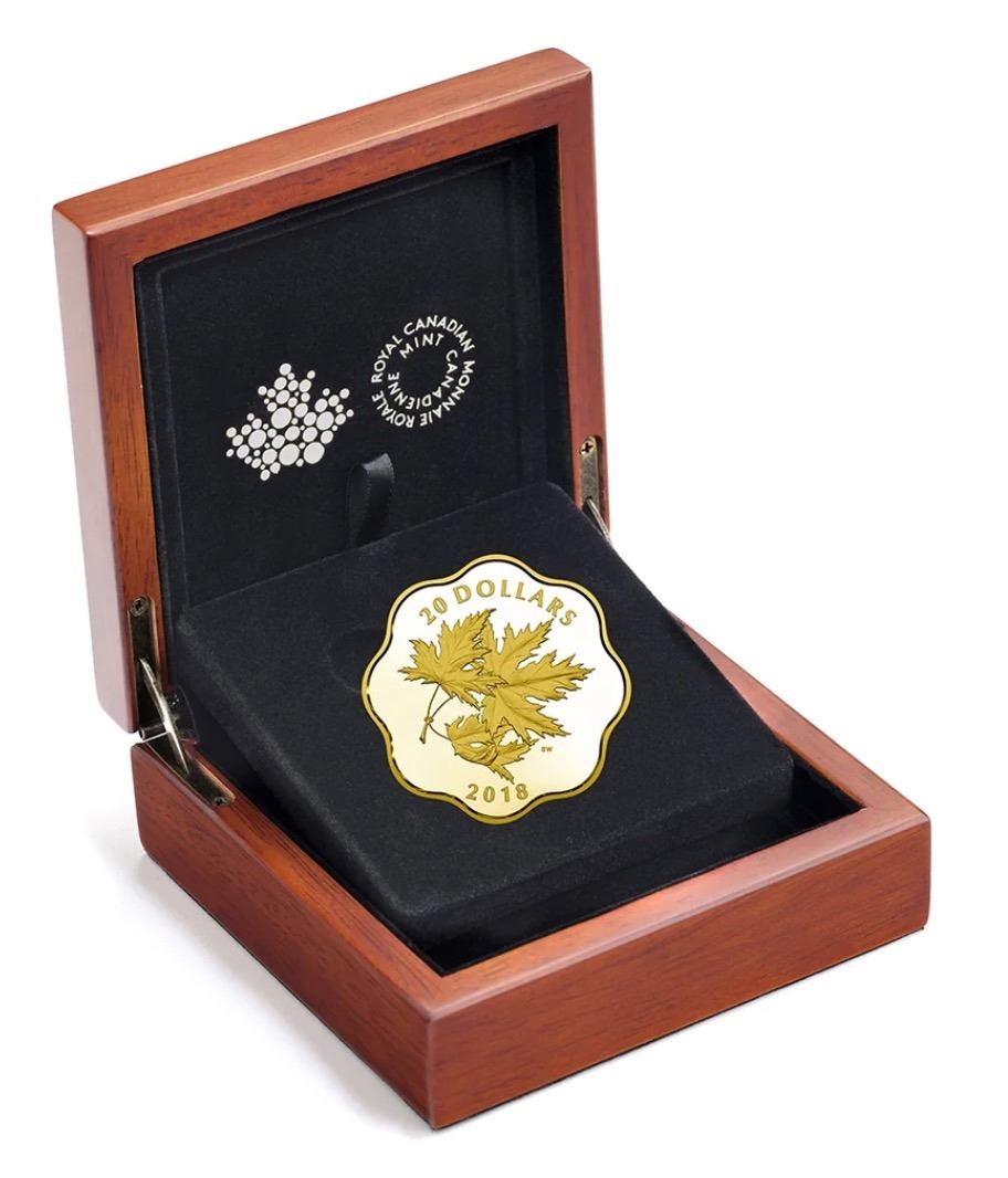 Produced by the Royal Canadian Mint, exclusive to the Master Club Loyalty Program. Fine Silver, Weight: 26.51 grams (0.852 Troy Ounces). Trio of Iconic Maple Leaves in Scallop-Shaped in proof finish with a limited mintage of 6000. Gold plated. In case of issue with COA and out beauty box. RCM #167950.