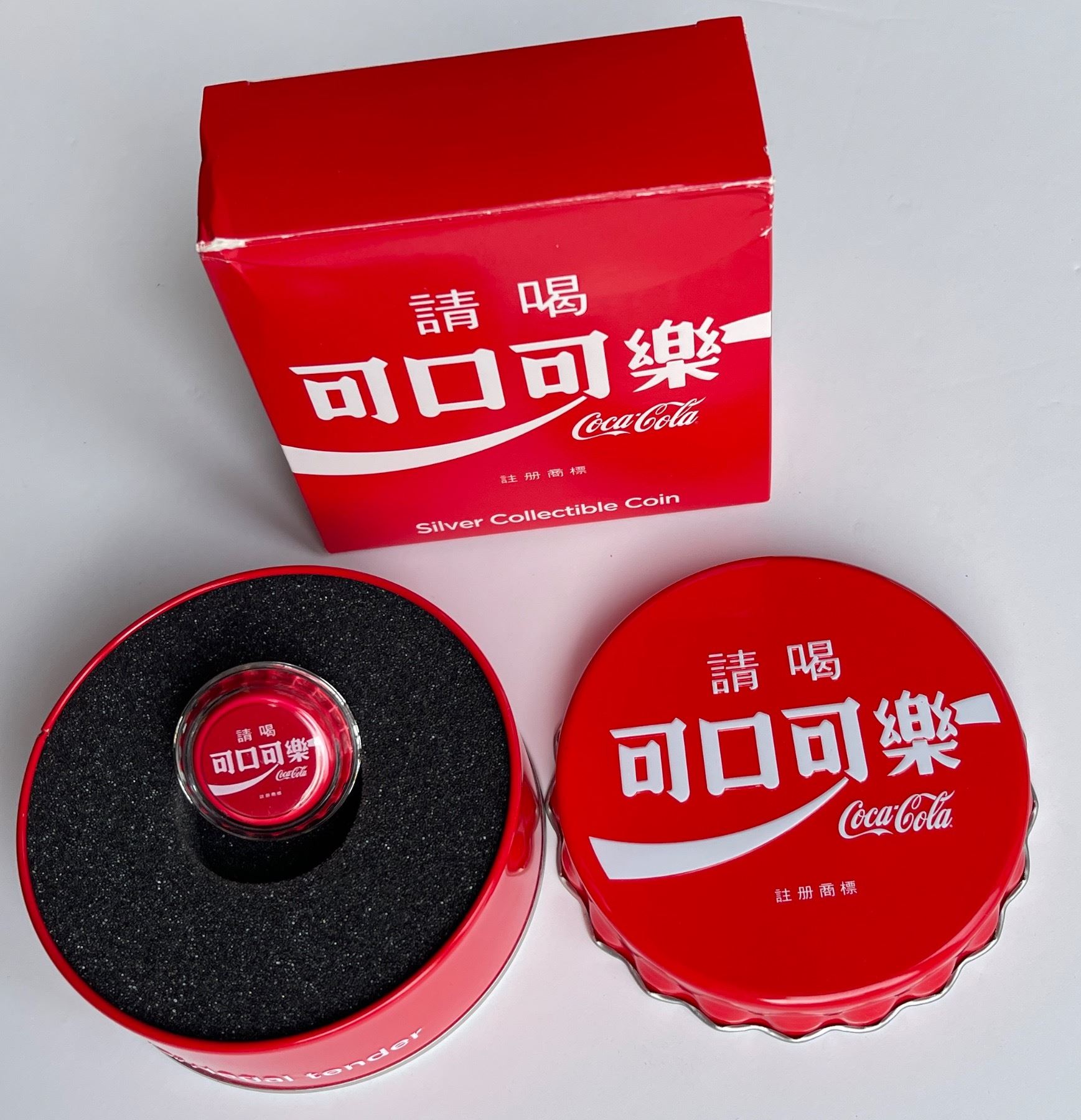 This highly collectible and sought after Silver bottlecap representing how Coca-Cola is shown in Taiwanese, issued by the Reserve Bank of Fiji is a 6 gram Fine Silver $1 Coin, comes with Collectible Coca-Cola Tin, COA #0881 and Box.