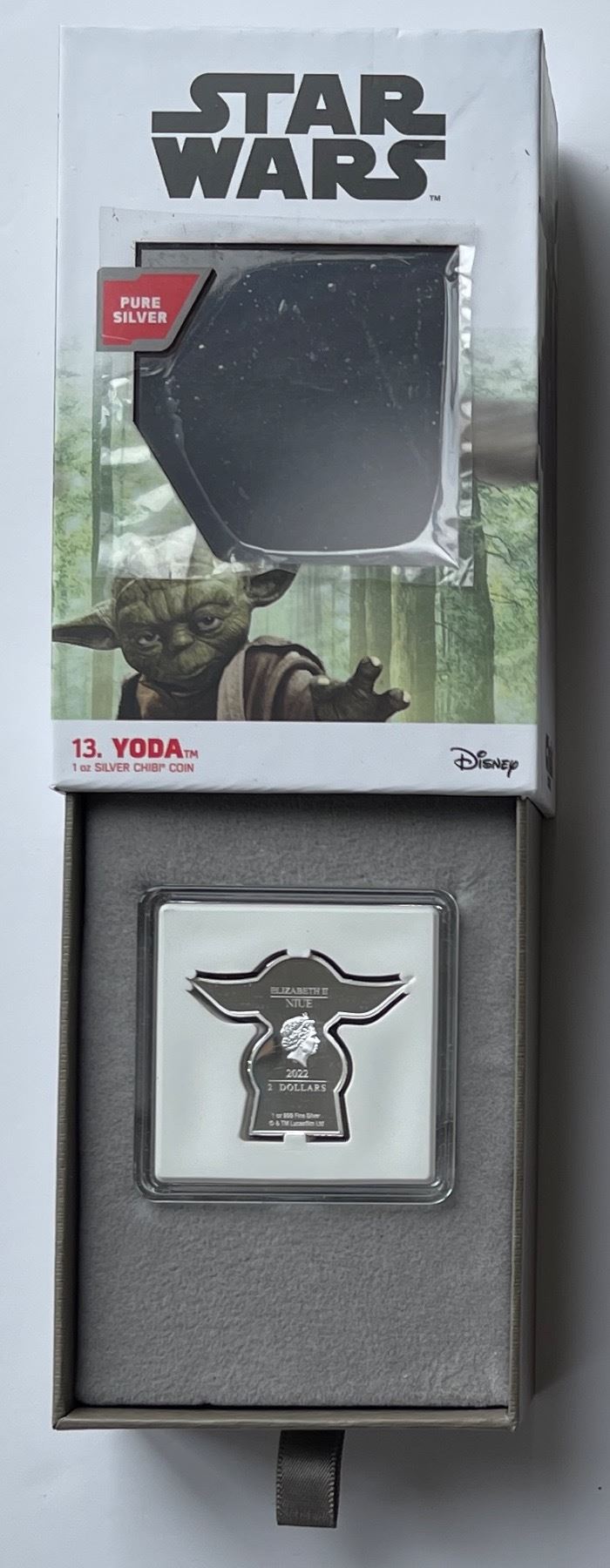 2022 Niue Star Wars Yoda 1 oz Fine Silver Chibi Coin. Limited Sold Out 2000 Mintage with Display Box Serial #544.