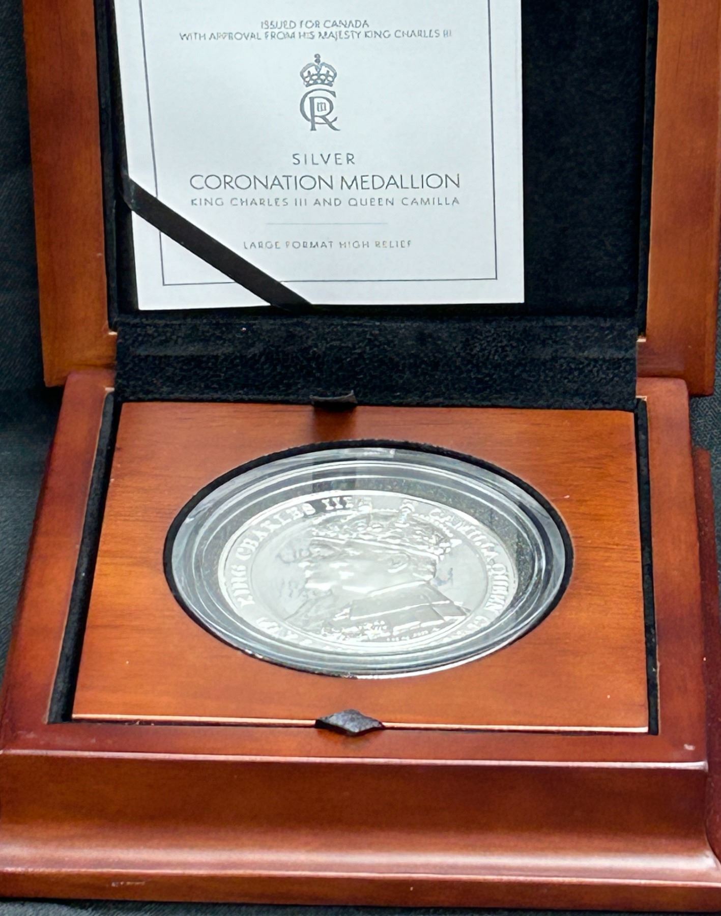 Medallion - 220/600. Composition: 0.9999 Fine Silver. Diameter: 65.25mm. Weight: 155.5 g. Bullion Weight: 5 Troy Ounces. Artist: Susan Taylor. Finish: Frosted proof. Edge: Serrated.The coin are encapsulated, and presented in a wooden box. Monarch: King Charles III.