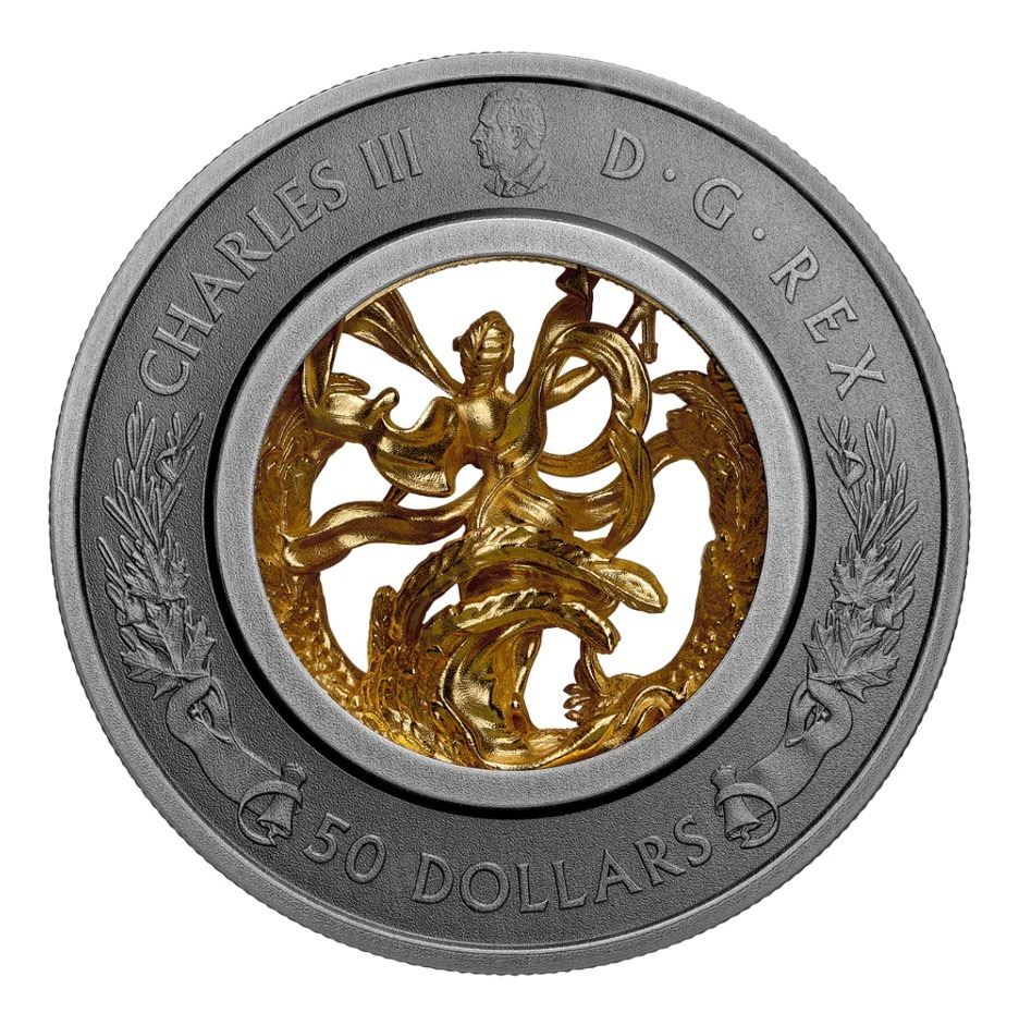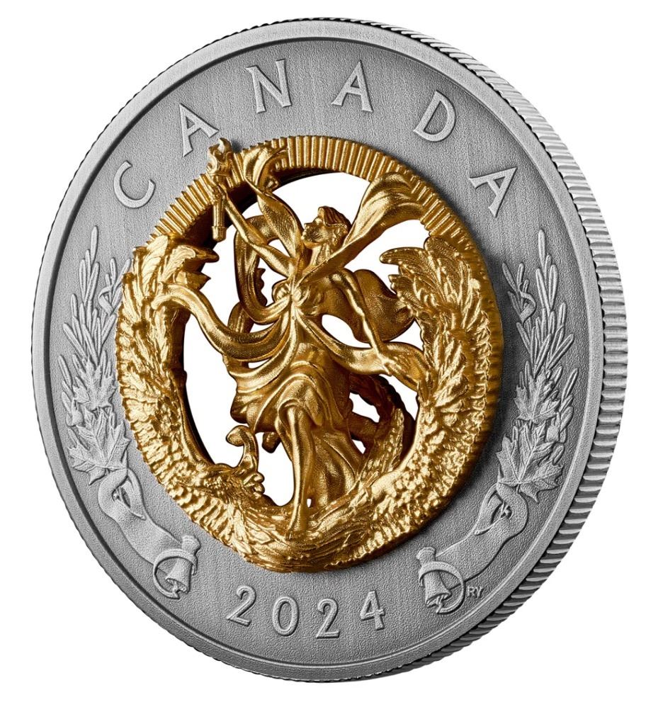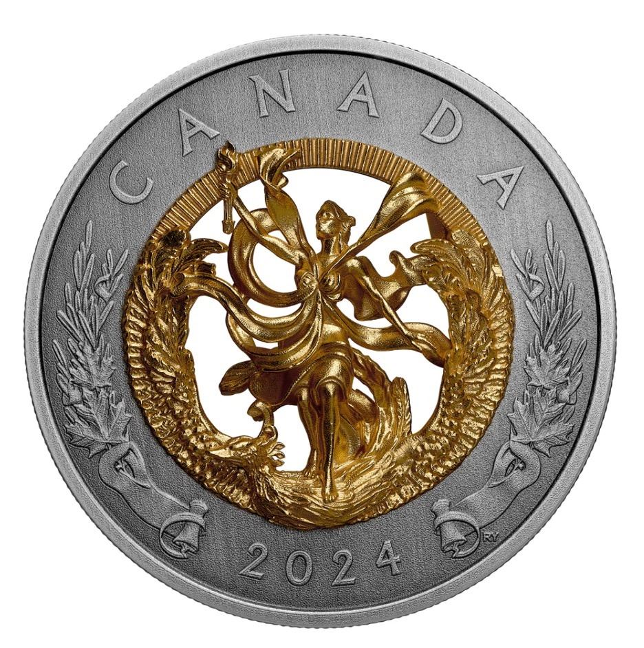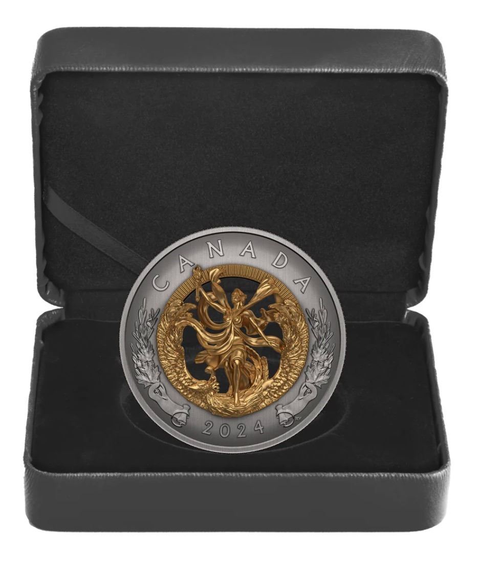 Mintage: 1,400. Composition: 99.99% pure silver with a gold-plated cast in 99.99% pure silver. Weight: 104.63 g (outer ring), 38.44 g (silver cast) (total 143.07 g). Diameter: 65.25 mm. Finish: Antique Finish. Edge: Serrated. Artists: Rebecca Yanovskaya (reverse and obverse), Steven Rosati (effigy on the obverse). The coin is encapsulated and presented in a supplement Royal Canadian Mint-branded clamshell case with COA. RCM #246777.