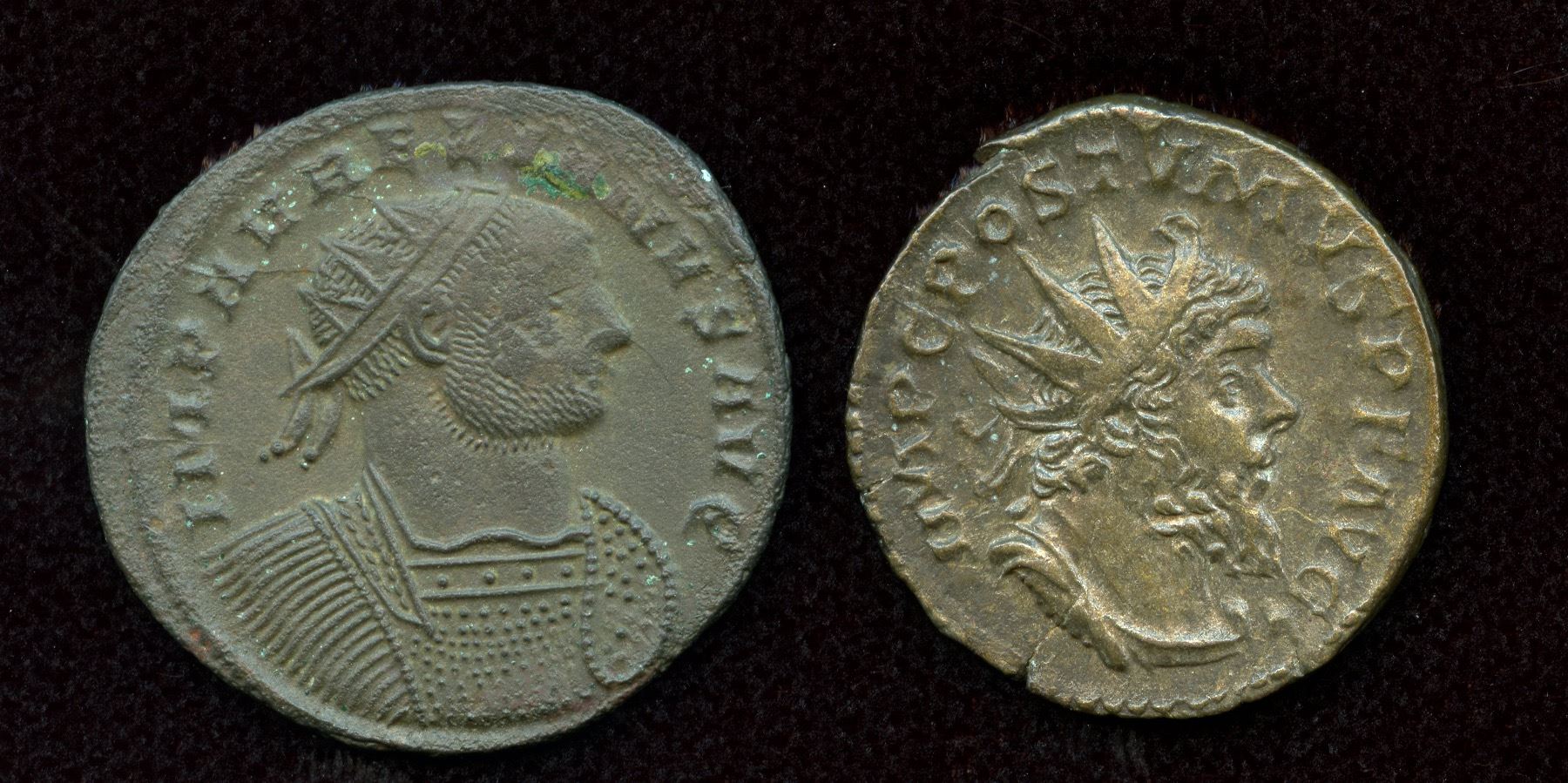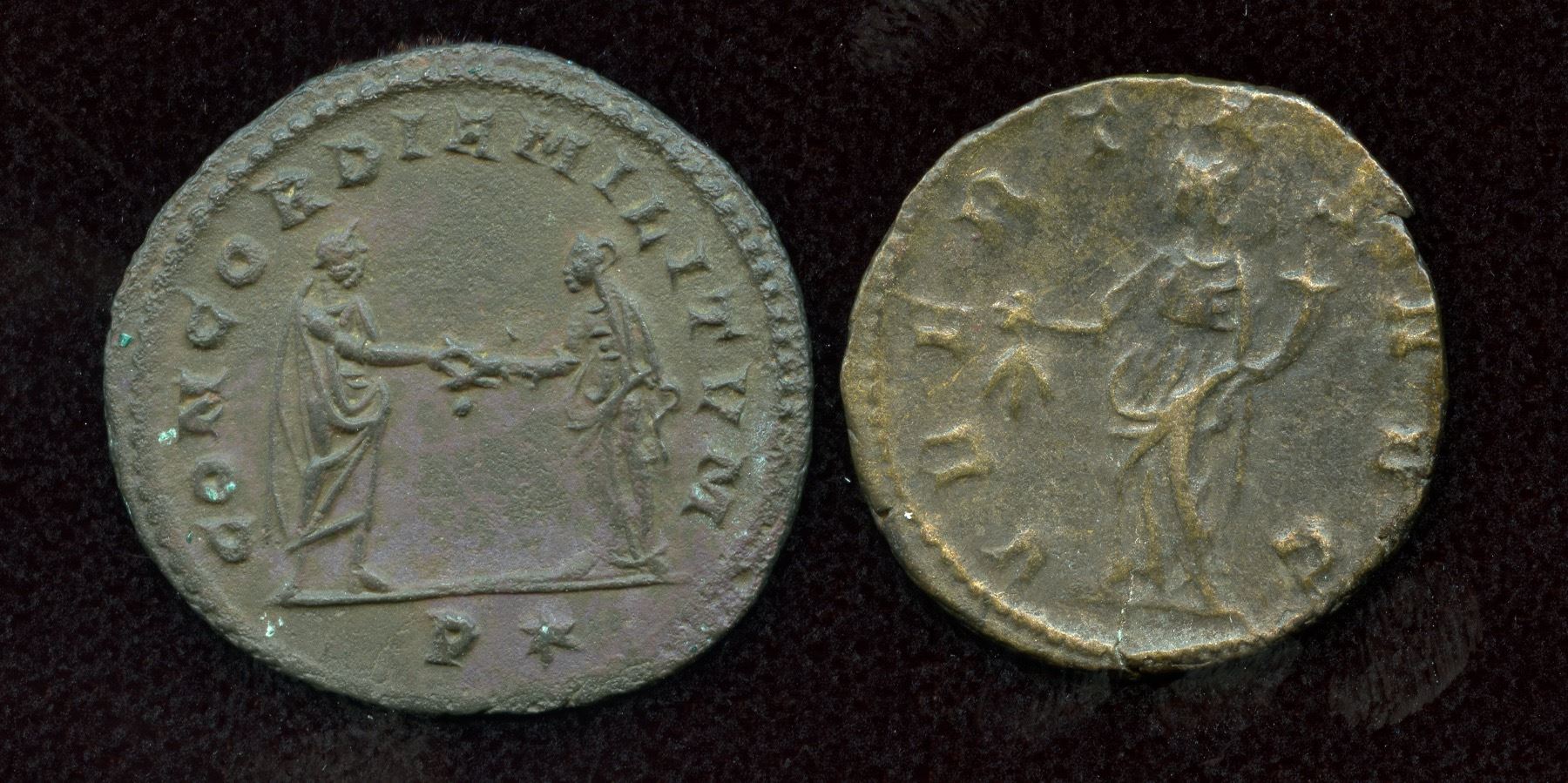 Postumus (3.56g) Rev: Uberitas stg. l. RIC 330; gVF, minor porosity on rev || Aurelian (3.89g) Rev: Aurelian & Concordia stg. facing each other. RIC 120; EF. 2 Pcs.