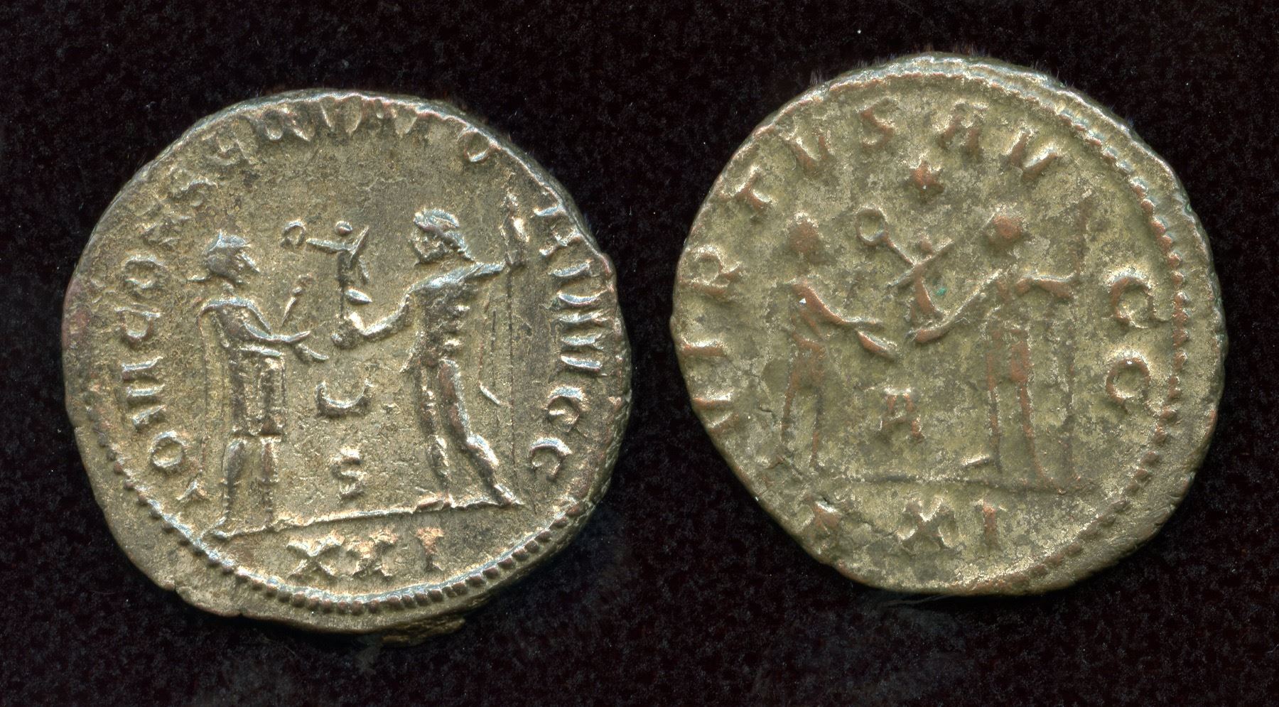 Carinus (3.76g) Rev: Carinus & Numerian stg. facing each other. RIC 325; gVF, worn rev die || Diocletian (4.21g) Rev: Diocletian & Jupiter stg. facing each other. RIC 325; gVF. 2 Pcs.