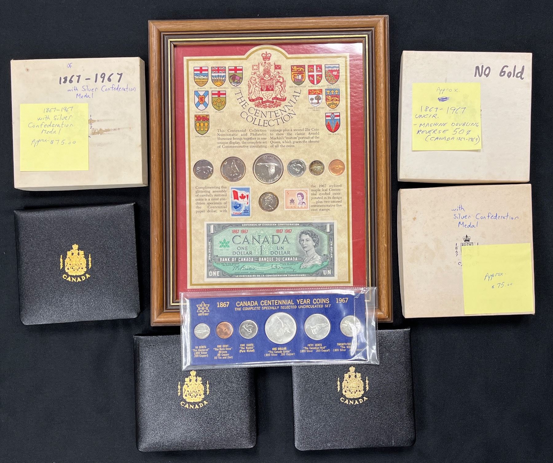 One set is framed, one in folder. The specimen sets are in cases, two sets have the confederation medals and 4 sets are minus the gold coin. 8 sets.