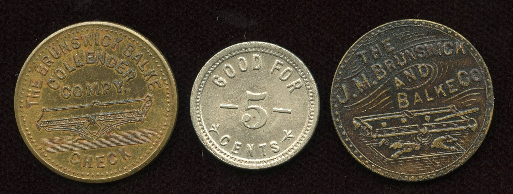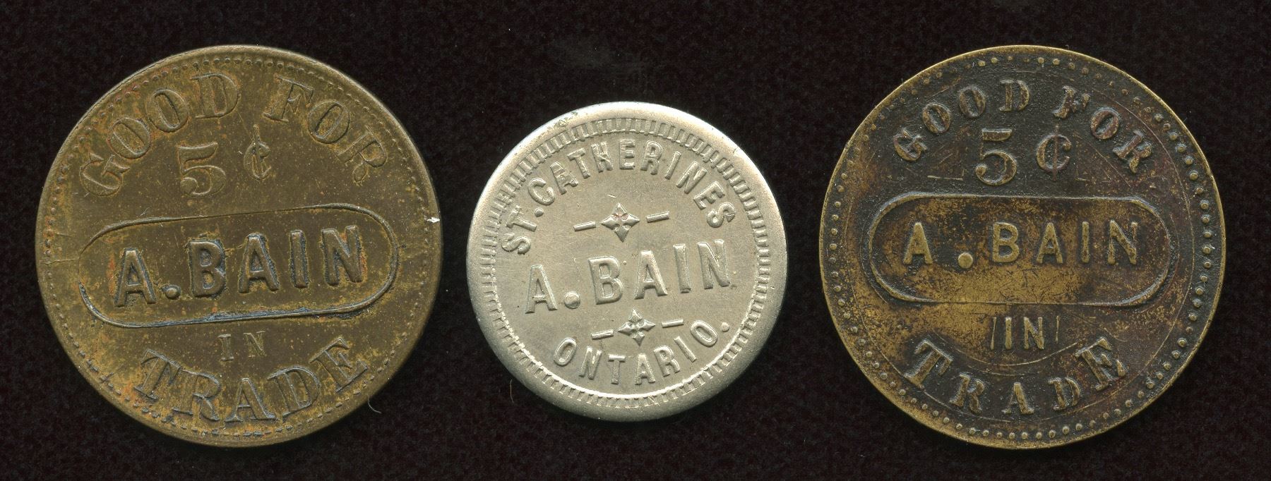 Br. 749, A. Bain, 5c, Brunswick Balke Collender, brass, EF; Br. 750. A. Bain, 5 cents, German silver, Unc; Br. 751, A. Bain, 5c, Brunswick Balke, brass, EF. 3 Pcs.