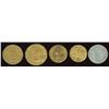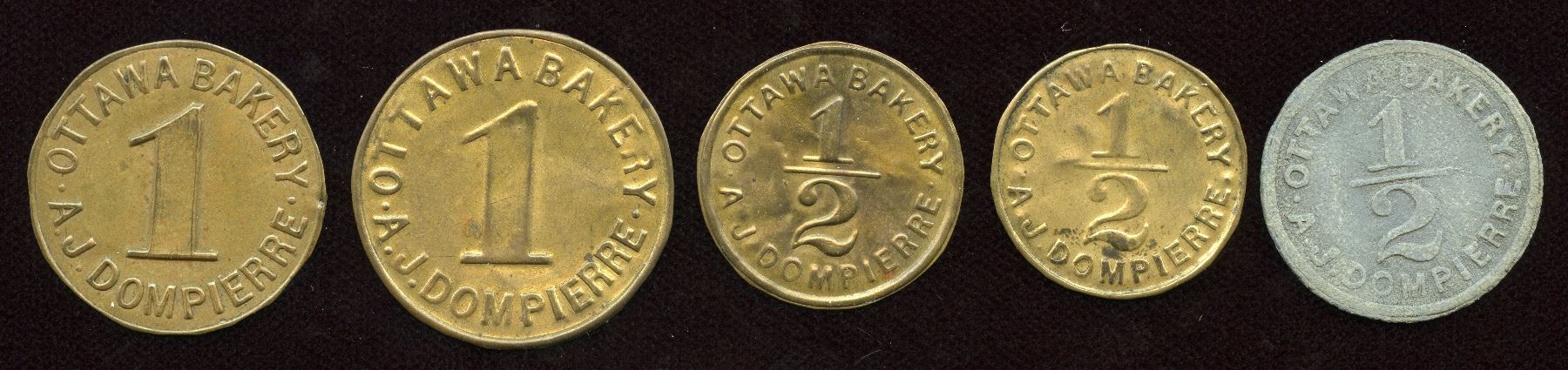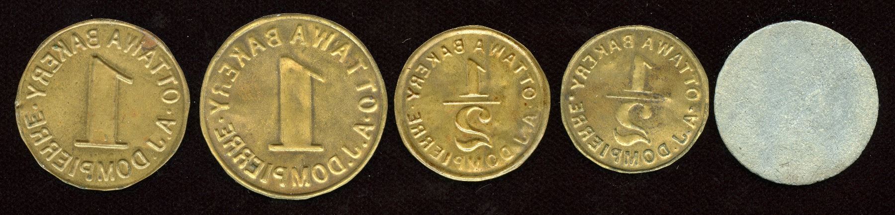 Br. 737, Astwood 1205c, 1 Loaf, top of one points to right side of B in Bakery, sheet brass, 30mm, EF; Br. 737, Astwood 1205d, top of one points to left side of B in Bakery, sheet brass, 32.5mm, EF; Br. 738, Astwood 1205a, 1/2 Loaf, sheet brass, EF; Same as previous but dot at 3 o'clock is closer to rim and centre arm in Bakery missing, EF; Br. 738, Astwood 1205b, 1/2 Loaf, Lead, VF. 5 Pcs.