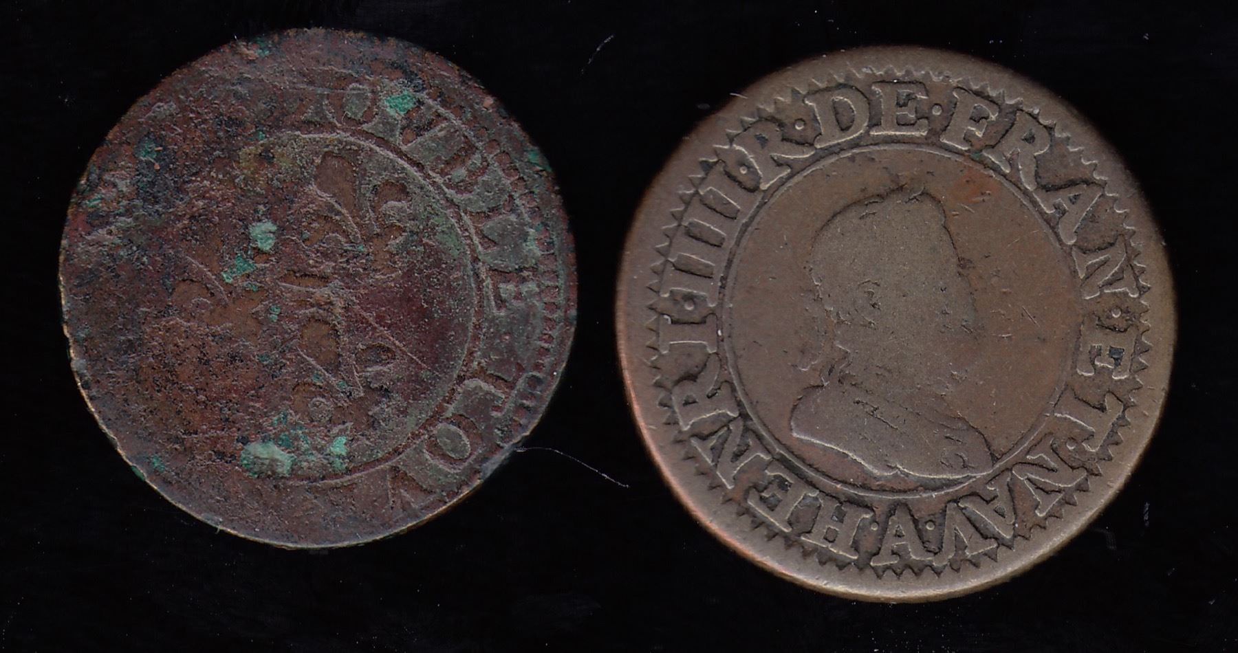 The first a reverse brockage of a 17th-century denier tournois, Fine, unevenly struck, some old corrosion; the second a heavyweight 1607-A (cf. Dup. 1273, KM 16.1), Paris mint, 5.59 grams, reeded edge, clean and problem-free F+ -- a thick and heavy piece, but seems rather worn to be a true piedfort. 2pcs.